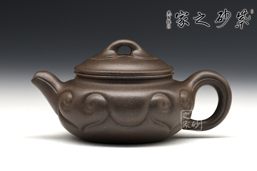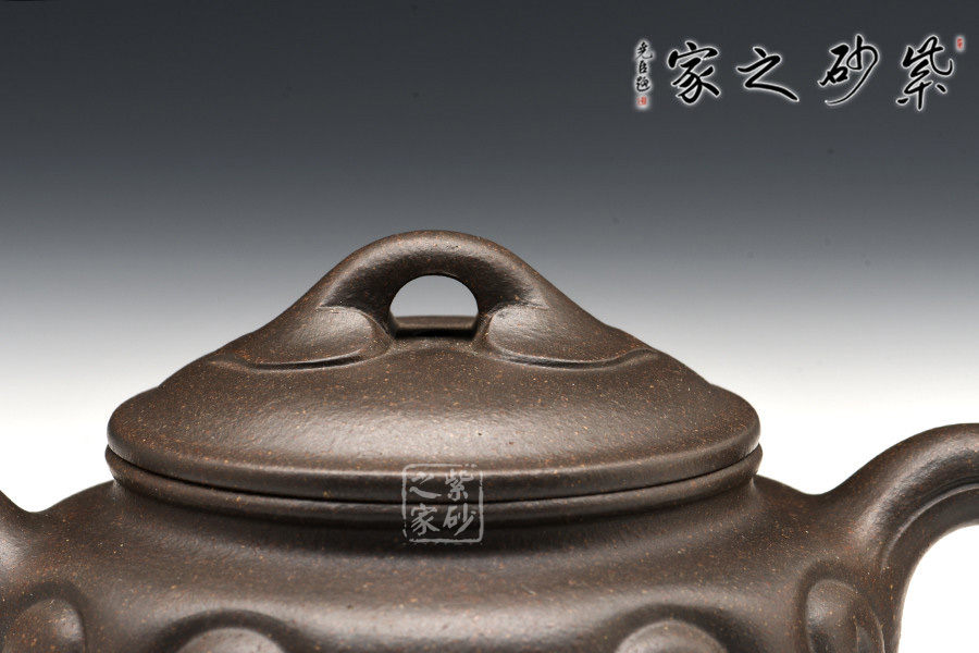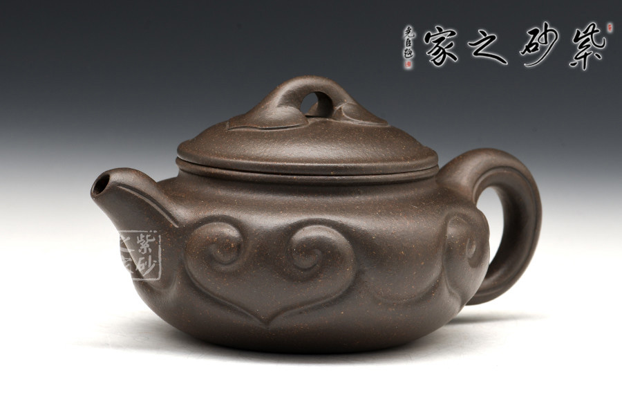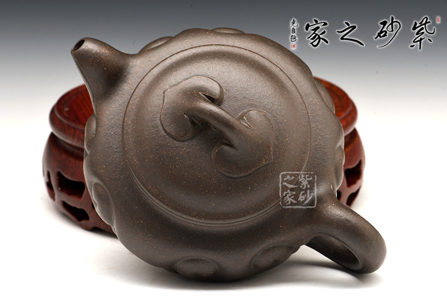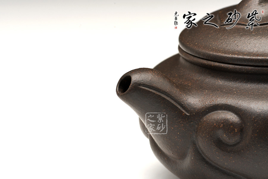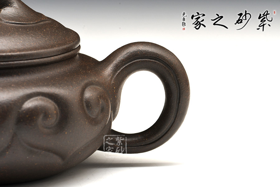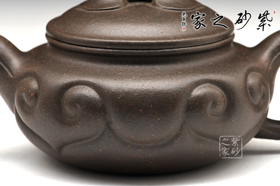 扁圓腹,短彎流,環(huán)狀柄,闊口臥足,壺口與壺蓋邊沿相吻合成一條飽滿燈草線,口、蓋各占其半,無扎實功力不能為之。壺腹飾以如意紋,與橋形如意鈕相呼應,于傳統(tǒng)造型中見新意。