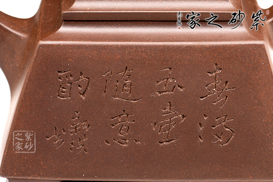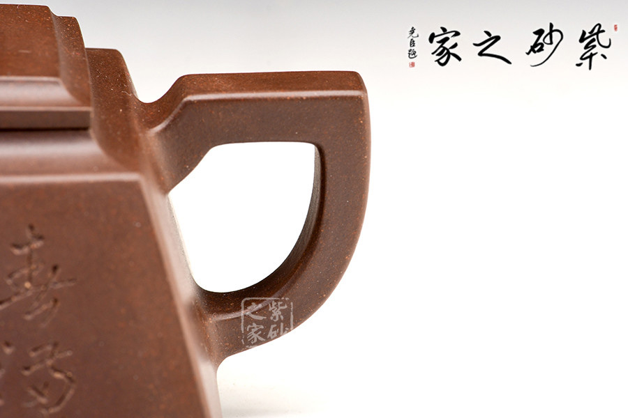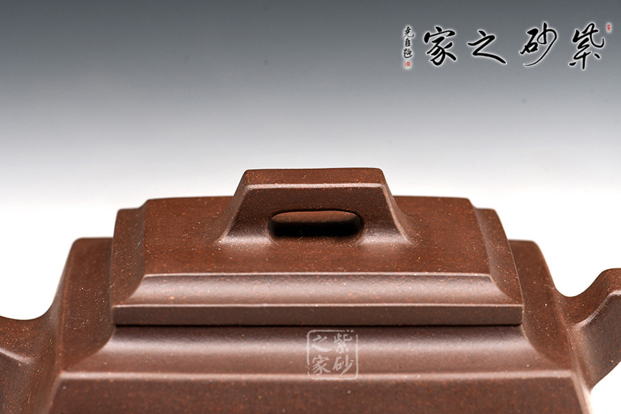 一方頂三圓,紫砂方器比圓器更難做。壺體造型方體,型制方正,平蓋橋形鈕,短直流,方圈把。整體造型比例協(xié)調(diào),棱角分明,給人以挺拔硬朗的氣勢,于穩(wěn)健中見大氣度。