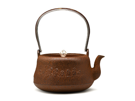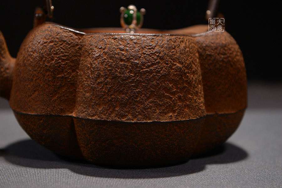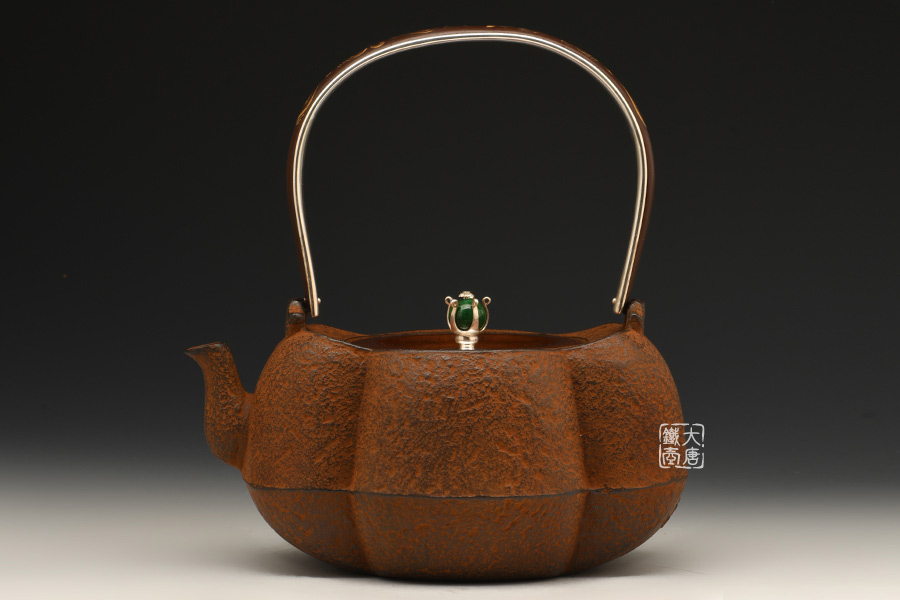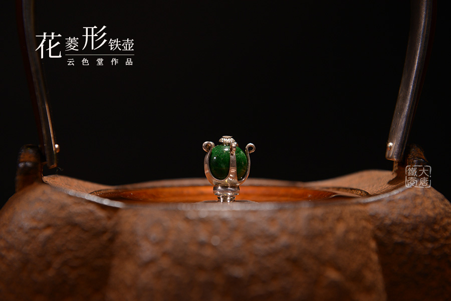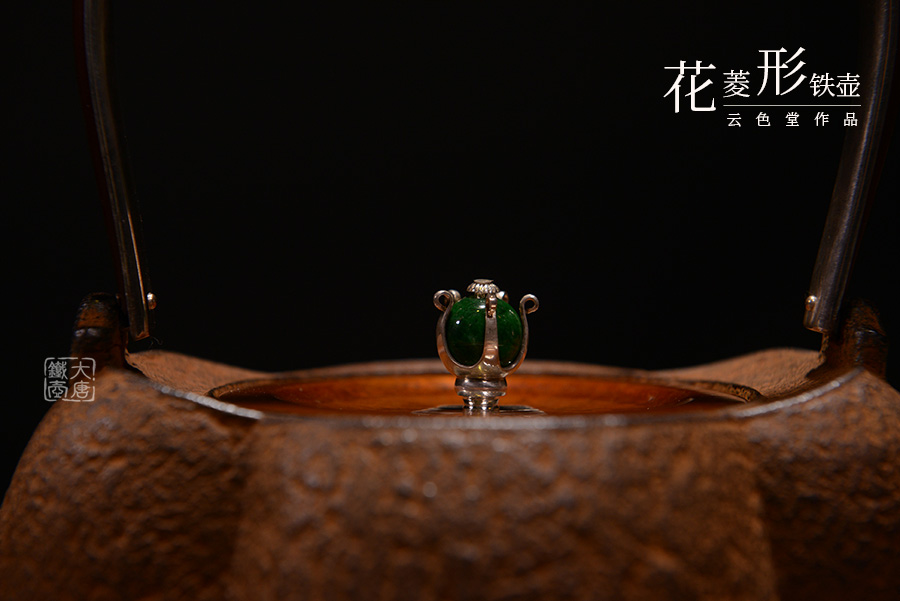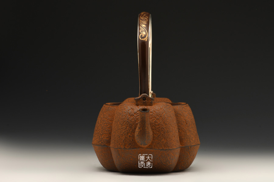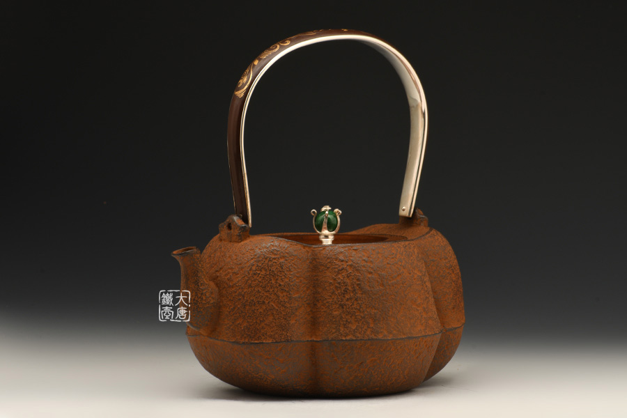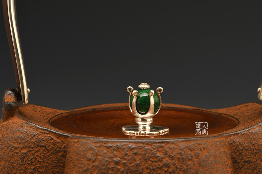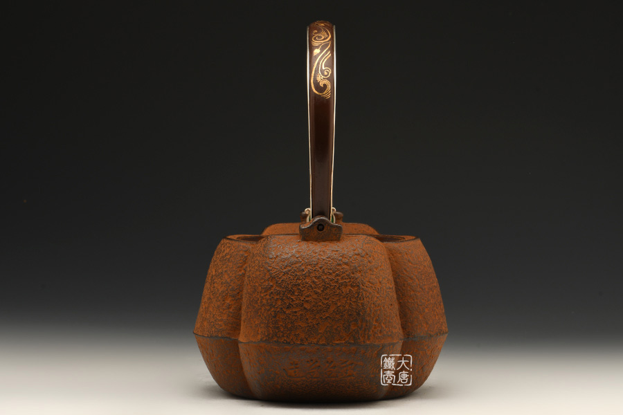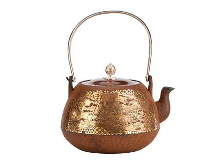 云色堂的鐵壺以豐美的裝飾技巧最為人稱道,描金及鑲金技術十分成熟。紋飾圖案的線條借鑒了日本古典瓷器的樣式。同時在一些細節(jié)的構建上,云色堂也不惜使用珍貴的材料來彰顯他華貴的氣質。在眾多堂口的鐵瓶中,這種特色使得其作品有很強的辨識性。
