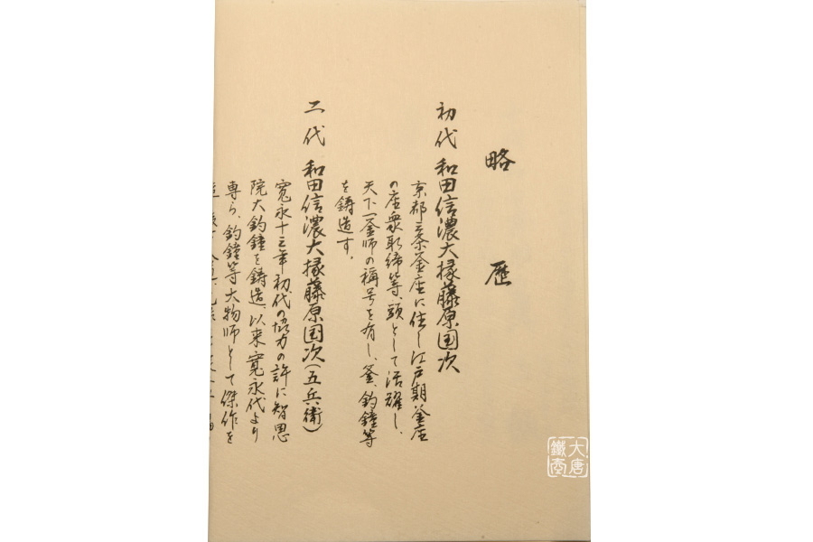 云色堂創(chuàng)建于江戶時期的京都,距今已有上百年歷史。創(chuàng)始人和田信濃大掾藤原國次是京都當時赫赫有名的釜師,被譽為“天下第一釜師。之后的幾代堂主皆為御用釜師,參與建造許多大寺院梵鐘,如大德寺、本能寺、妙心寺、黃壁山萬福寺、建仁寺、清水寺等,現(xiàn)存世梵鐘仍有百來座。