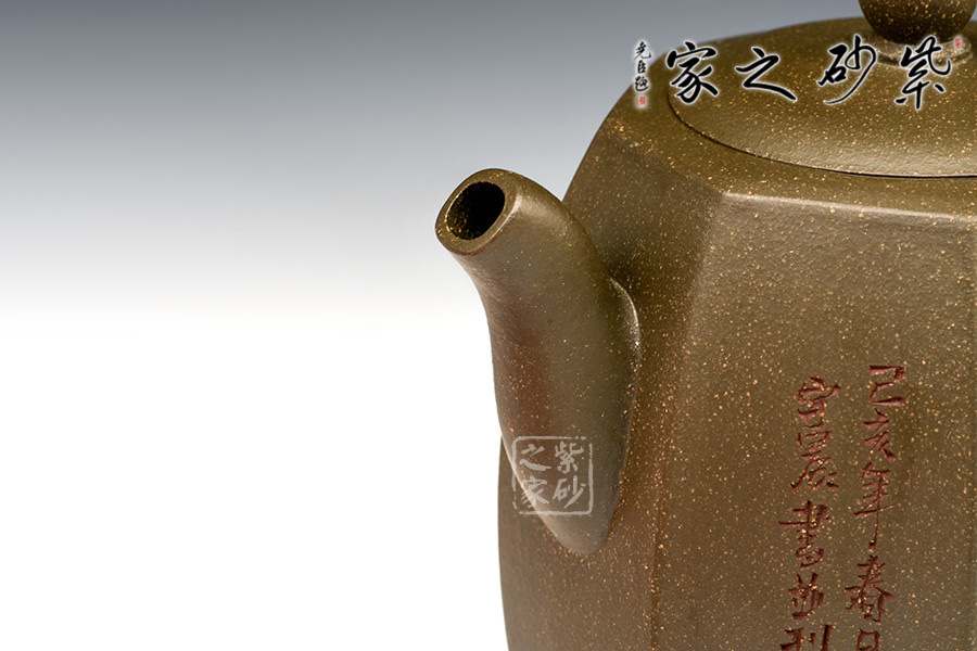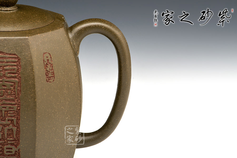 此壺沉穩(wěn)又不失老味,壺身方中寓圓,線條暢快飛揚,并配以樸拙的壺嘴與壺把。壺嘴三彎,婉轉悠揚,出水流暢。耳形端把寬和質樸,持握舒適。壺蓋形如寶鼎,壺鈕圓若明珠,晶瑩剔透。