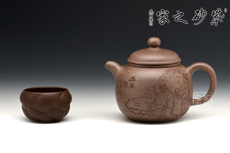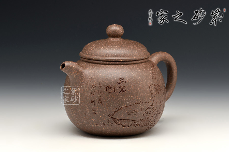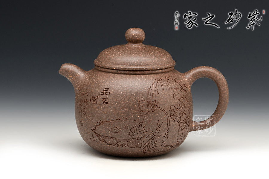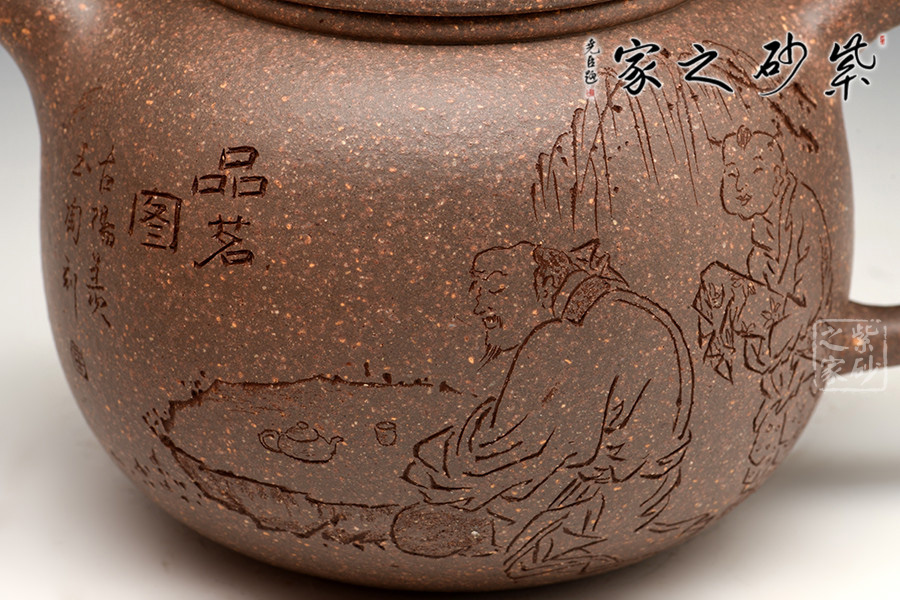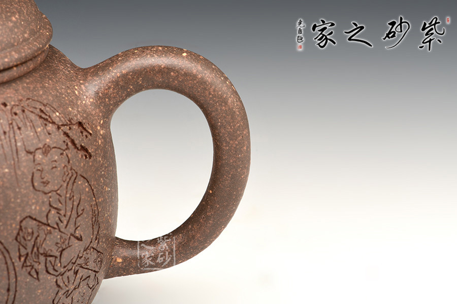 自制自銘,刻工精湛,壺身裝飾以陶刻細(xì)膩的人物為主,尤喜童子、美女、老翁,堪稱一絕。