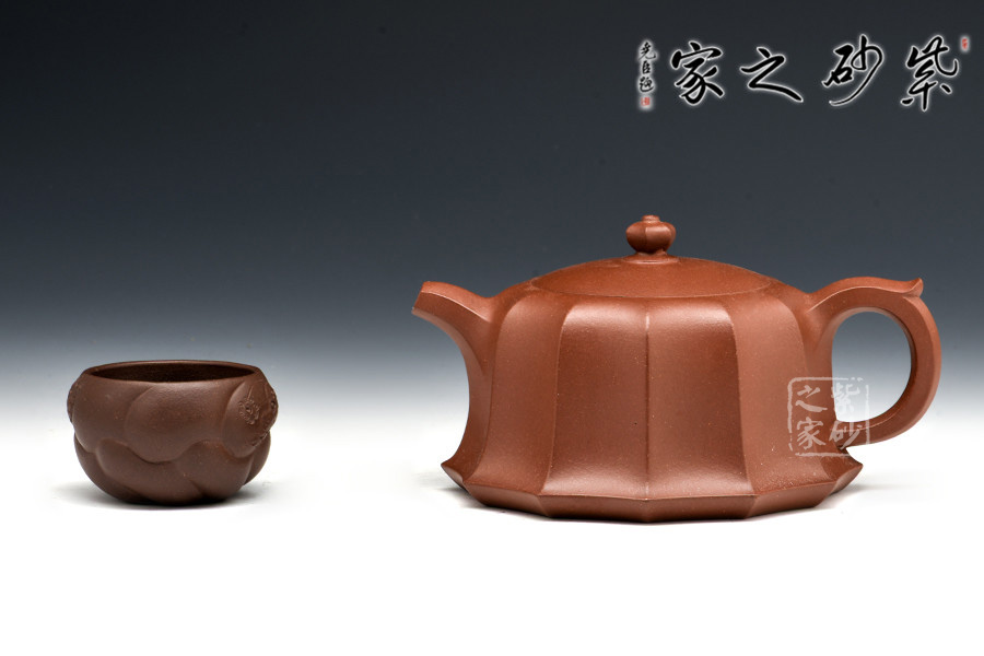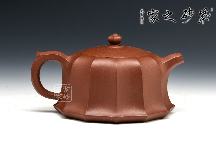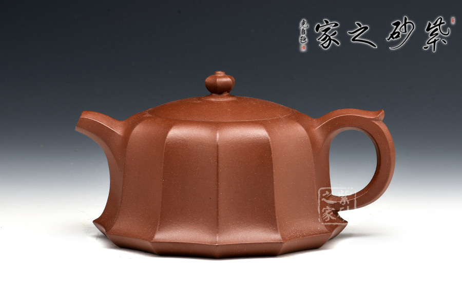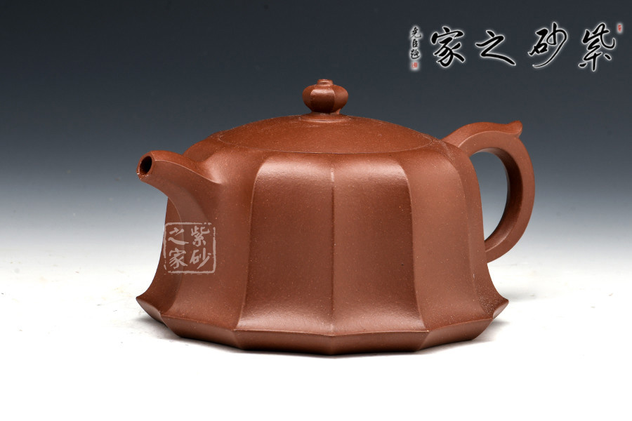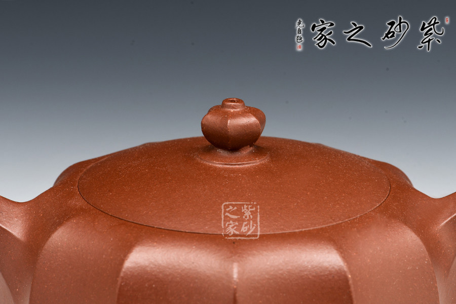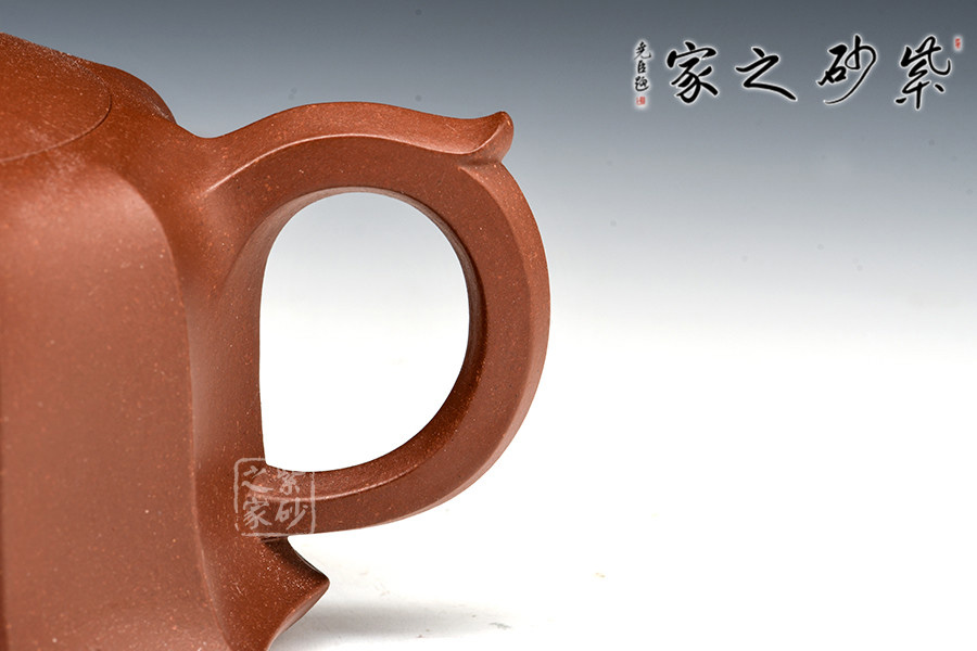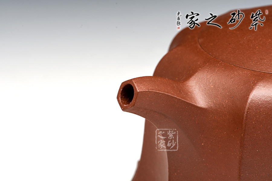 此壺的壺鈕、壺嘴、壺柄、壺身均采用方圓結(jié)合造型,古典優(yōu)美,氣韻高雅。六方壺鈕與壺身上下貫氣,筋紋分布均勻,嵌蓋設(shè)計氣密性極好,倒茶不溢出。坡肩造型極其優(yōu)美,干脆利落。