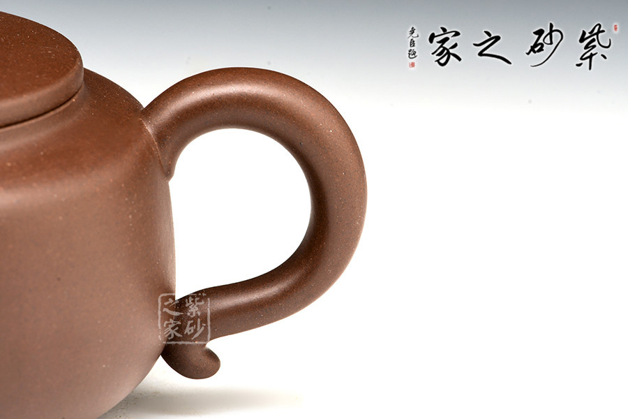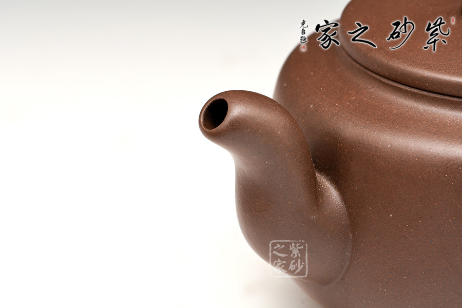 平蓋微坡,穩(wěn)住架勢(shì),拱形鈕,壺嘴三彎,耳形把有垂耳,富有張力。整壺彰顯質(zhì)樸大氣,比例和諧,其力度、質(zhì)感、虛實(shí)對(duì)比等皆恰到好處。