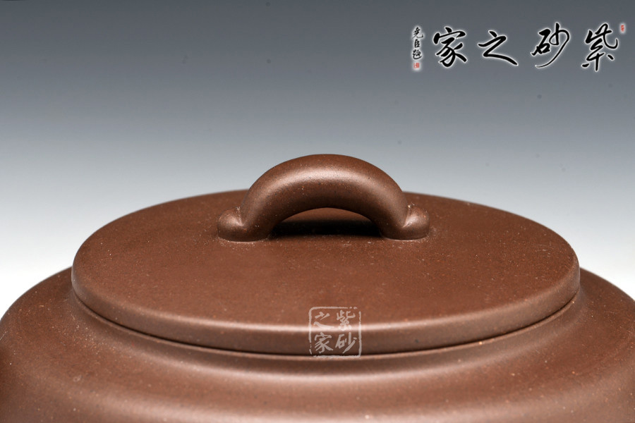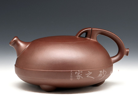 此壺造型簡(jiǎn)練大方,做工精細(xì),美妙絕倫。形體扁圓,肩部折線圓棱,口與肩平滑舒展,腹肩口產(chǎn)生曲折剛勁的張力,底部圓潤(rùn)豐滿。