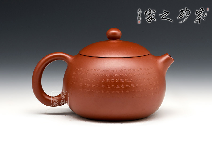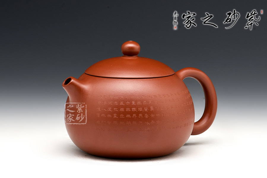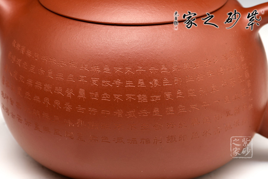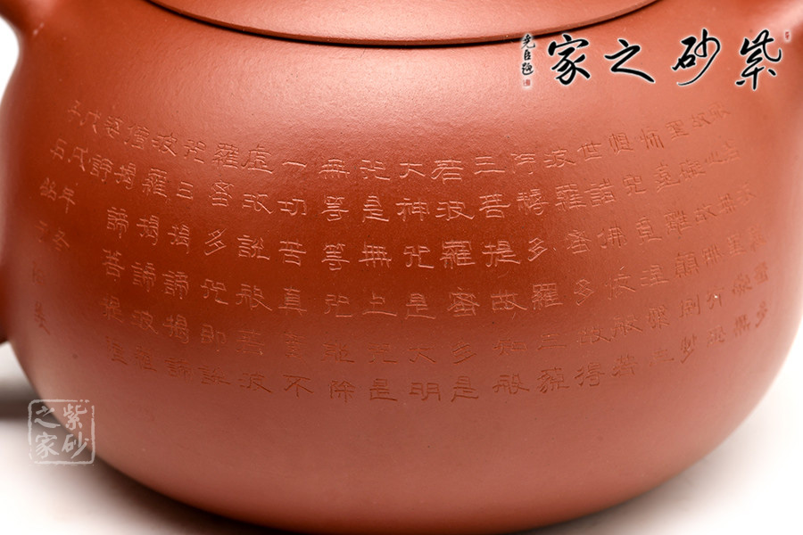 禪茶一味,茶性和佛性是統(tǒng)一的,都在清心、妙悟。紫砂壺上手刻《心經(jīng)》,這讓紫砂披上一層佛家的霞光瑞靄,熠熠生輝。品茗之時,手中摩挲,心中默念《心經(jīng)》,品茶,亦是參禪。