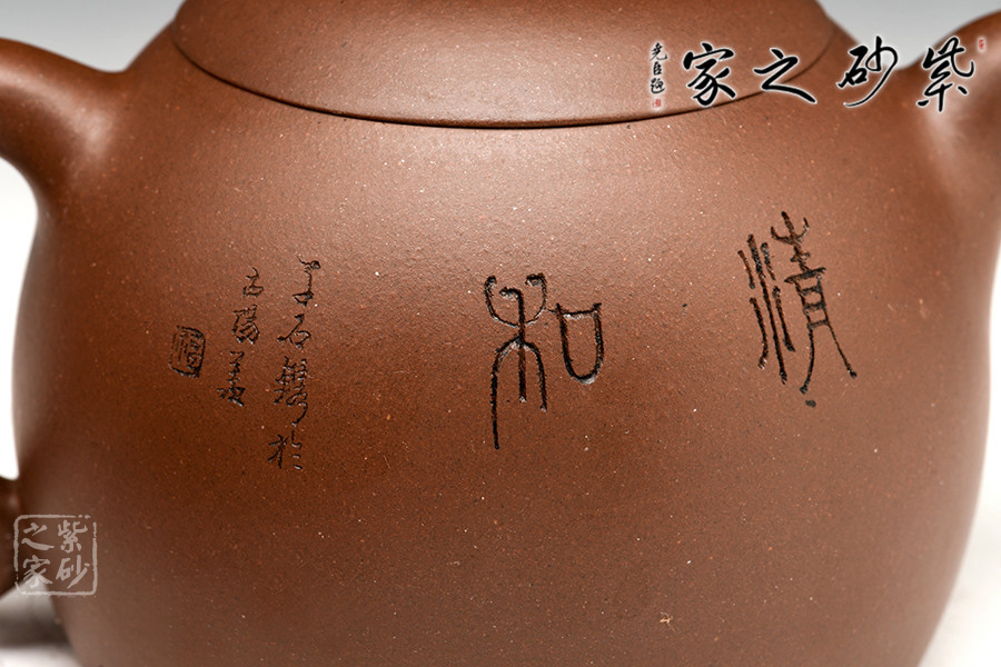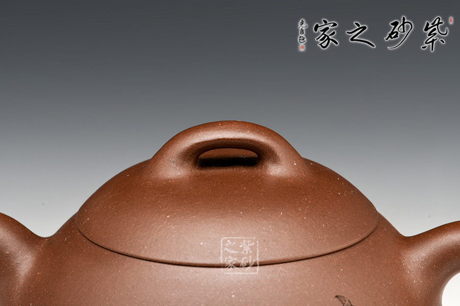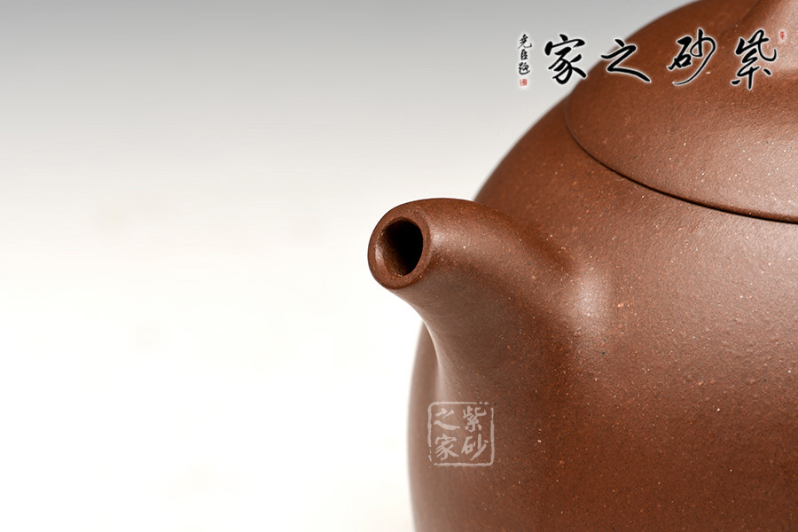 秦權(quán)壺有古金鐘之風(fēng),敦厐厚重,挺拔舒展。半圓形截蓋,二彎壺流,短流向上微曲,力感十足,耳形飛鋬,線條流暢。整壺赭紅色,溫和中正,端莊沉穩(wěn),法度嚴(yán)謹(jǐn),新風(fēng)古意,頗耐品讀。