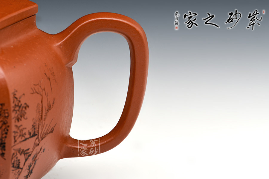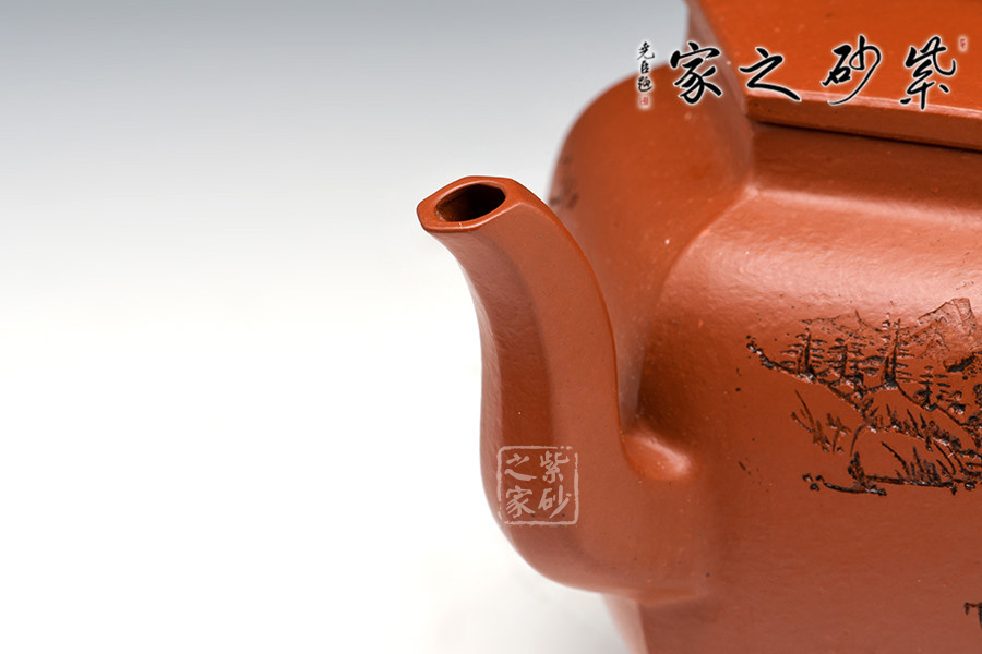六方壺鈕方中見圓,造型極其優(yōu)美,增添了壺的藝術(shù)感。壺柄緊挨肩線向上挑出,曲線流至飛處,向下而去,最終收于壺身下方。三彎壺嘴自壺身中部蜿蜒伸出,嘴口朝上,嘴頭略微向外伸出,形成彎流,極其優(yōu)美。壺底底線與肩線相呼應(yīng),更具宮燈形象,雅致非常。