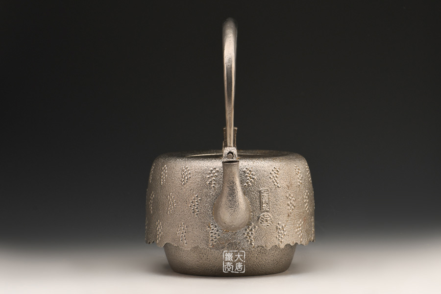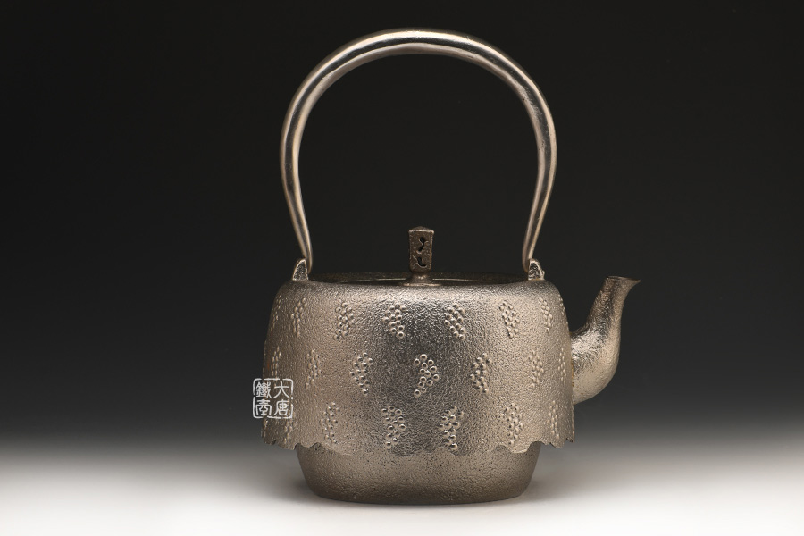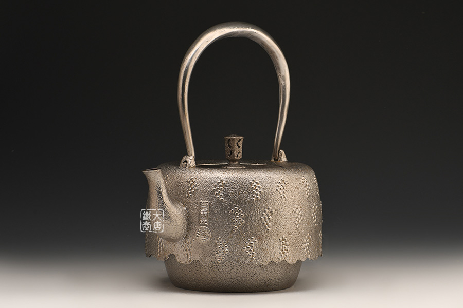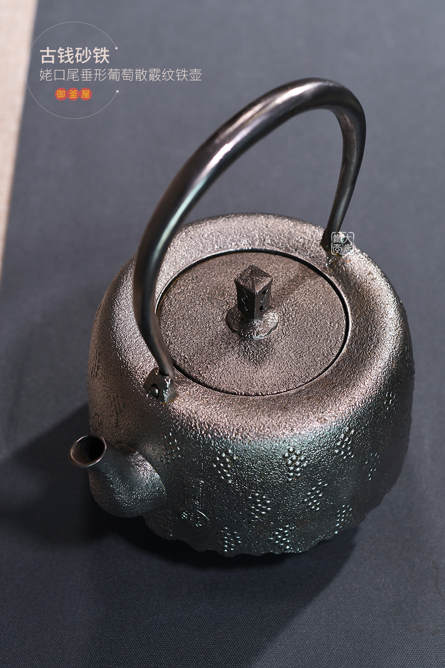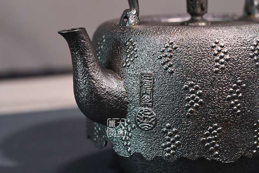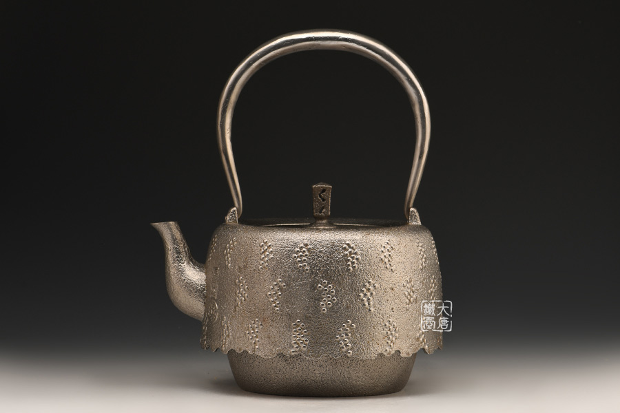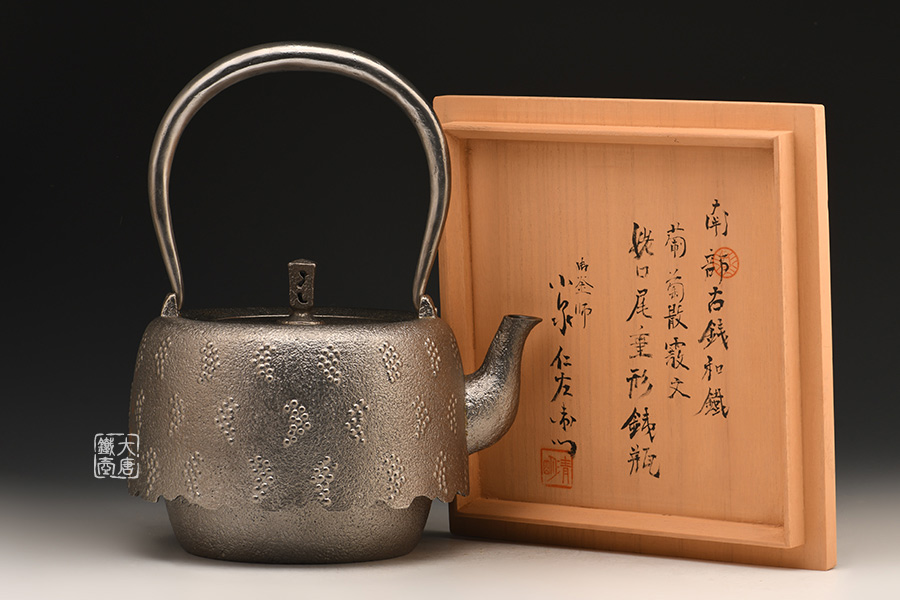 御釜屋 古錢砂鐵 姥口尾垂形葡萄散霰紋鐵壺 [ 編號:77262 ]