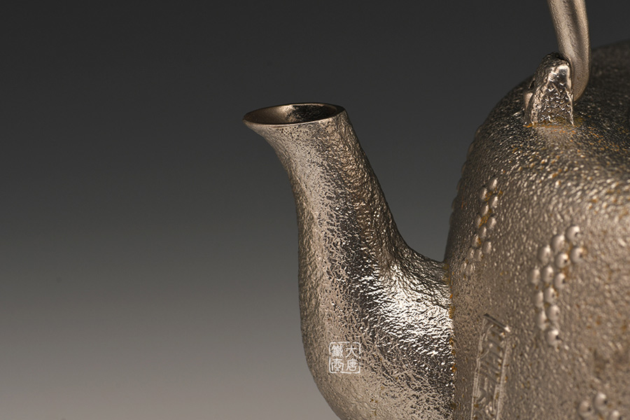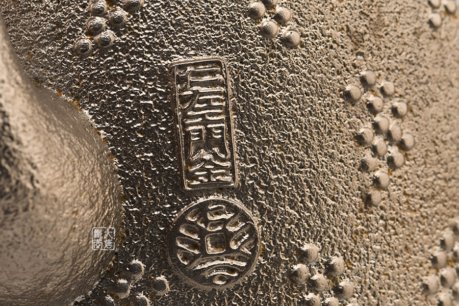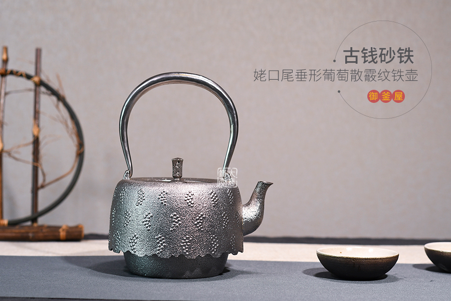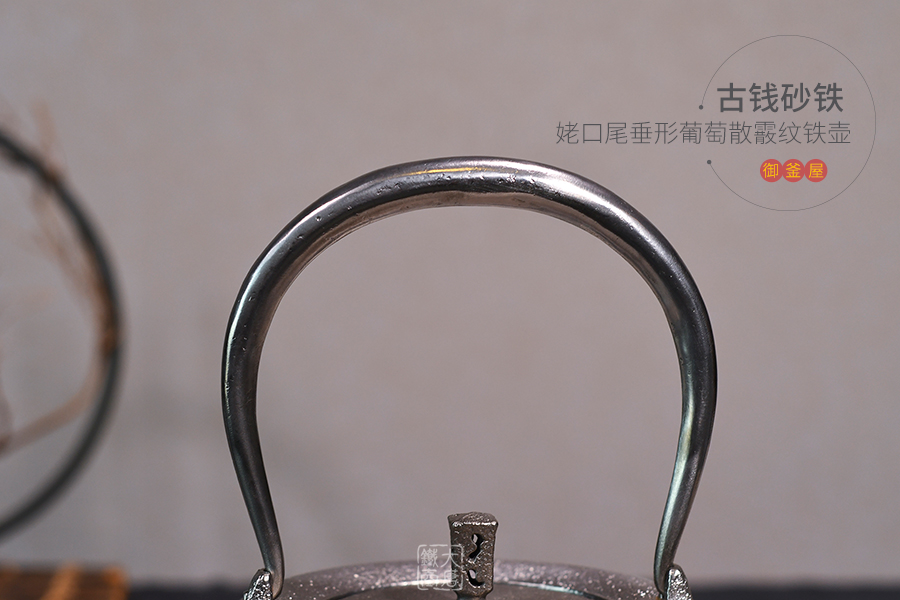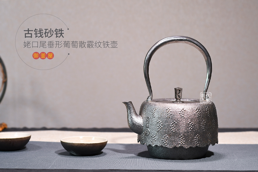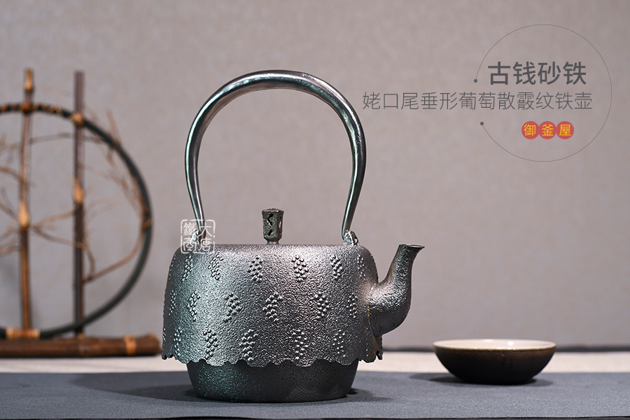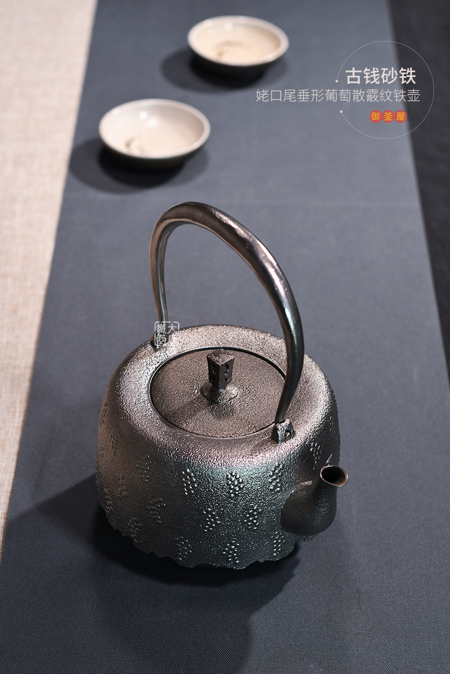 御釜屋 古錢砂鐵 姥口尾垂形葡萄散霰紋鐵壺 [ 編號:77262 ]
