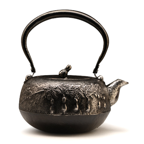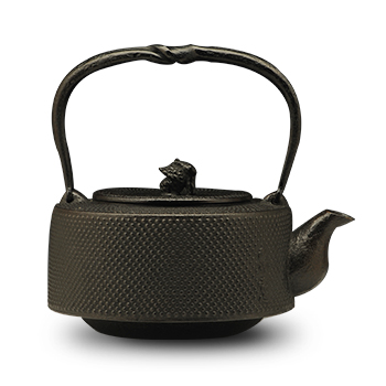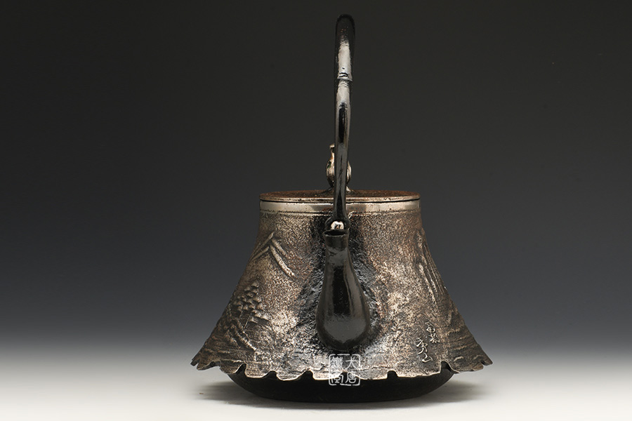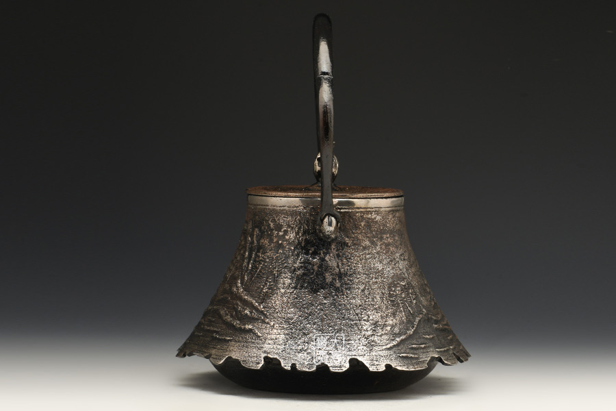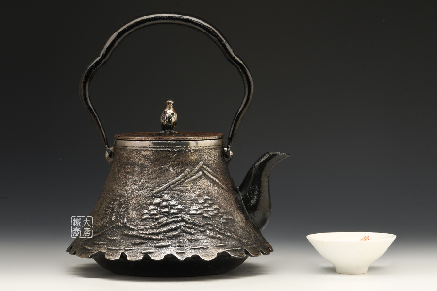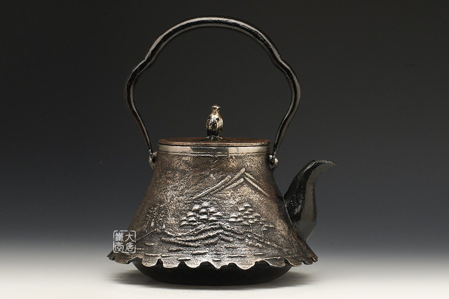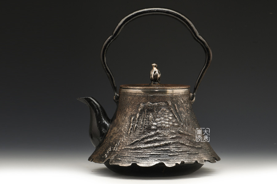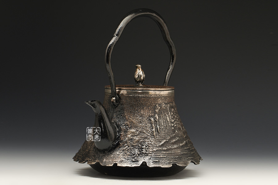 南部是鐵瓶的發(fā)祥地,御釜屋三代仁左衛(wèi)門將“手取釜”改造成鐵瓶,并固定了這種形式。所以從南部鐵瓶中可以明顯地看到茶釜的樣子。南部鐵器的追求古奧深沉的特點,大多以黑色來裝飾鐵瓶的表面,以期達成如長期受炭火熏燎的樣子。