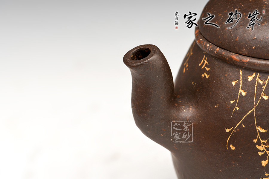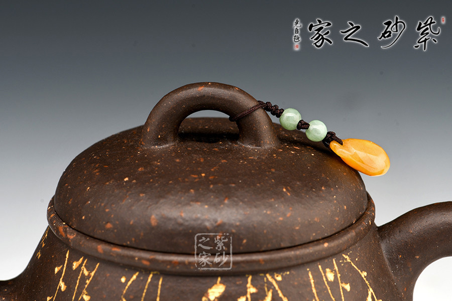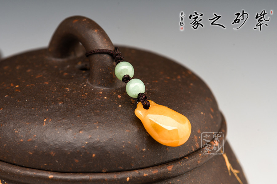 這把壺壺身整體圓潤(rùn)飽滿,也象征著我們提倡的處事之道,圓融貫通。這把壺的橋型壺鈕上配以一串玉石,仿佛象征著玉器與紫砂的結(jié)合本就是一種隨喜緣分。