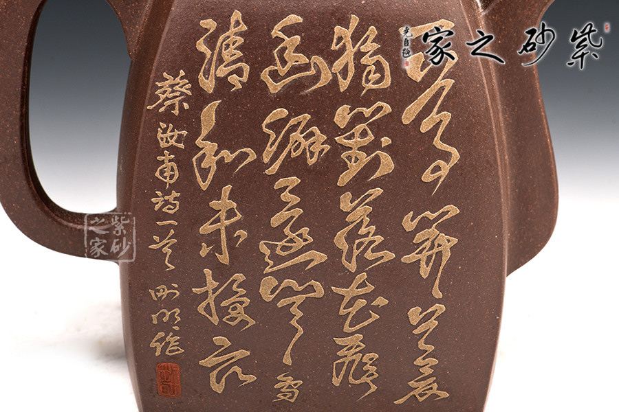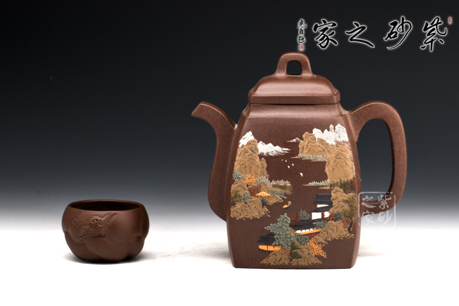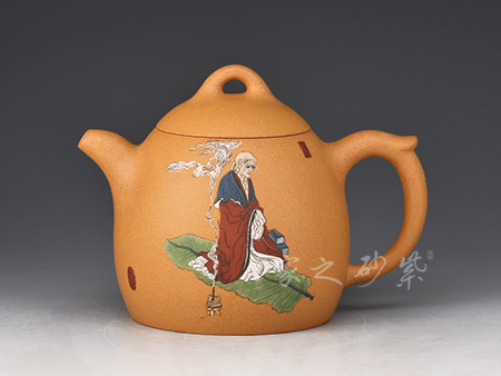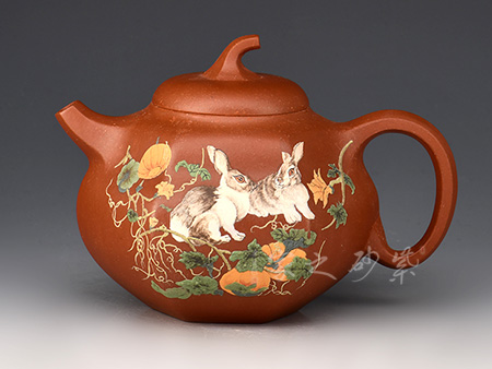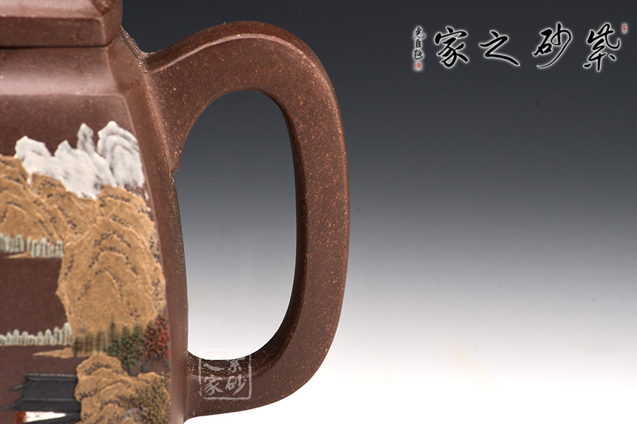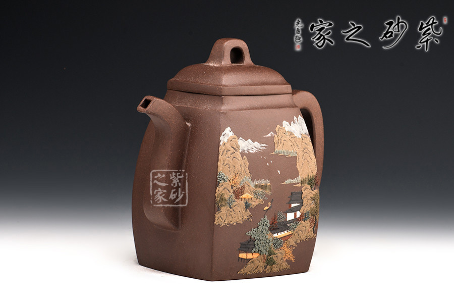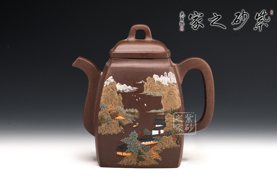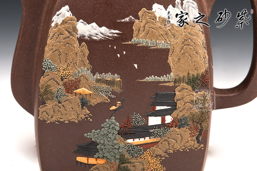 漢方壺乃紫砂古式,扁方壺體,壺流以四分之三平貼身筒,圓弧把,鈕似拱橋式,壺蓋吻合口蓋緊密,是紫砂壺中歷史最悠久的傳統(tǒng)造型之一。多大壺,兩側(cè)面留白,多數(shù)全身裝飾滿彩,以高檔的胭脂水兒等釉料輔以精湛的繪畫功力進(jìn)行裝飾,作品盡顯盛世之奢華。