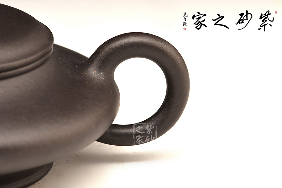 此壺為砂壺形制中的極扁型,藝趣盎然,也是早期紫砂造型的代表作品。壺平口唇邊、圓鈕、彎流、圓柄、圈足。器形線面屈曲和諧,寓瀟灑于織巧中,形隨扁而氣卻昂,剛?cè)岵?jì),神品也,扁圓的器型,給人一種虛懷若谷,逍遙自在的感覺。
