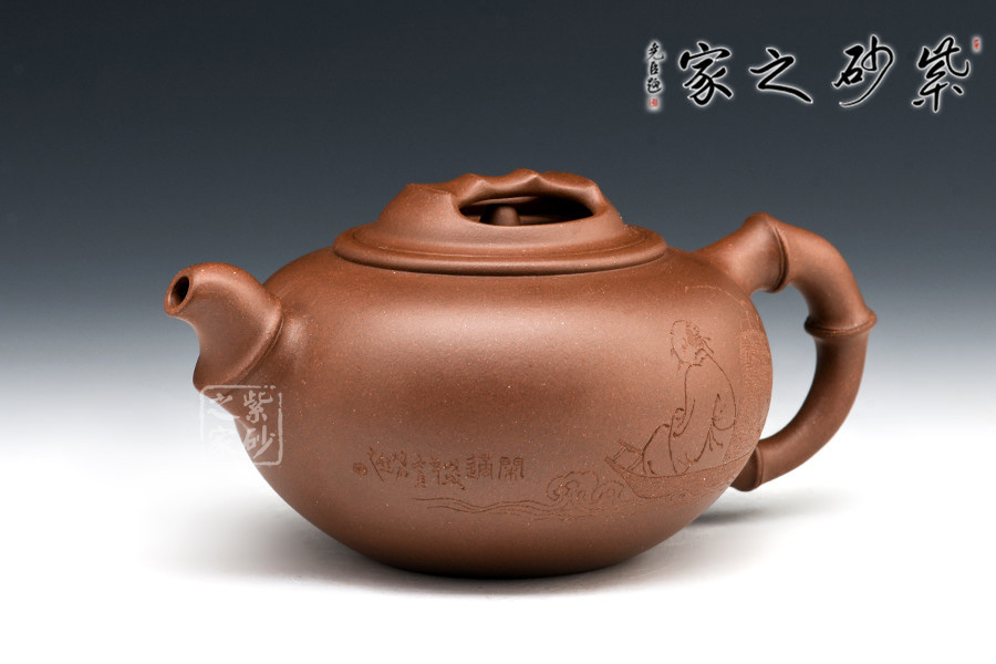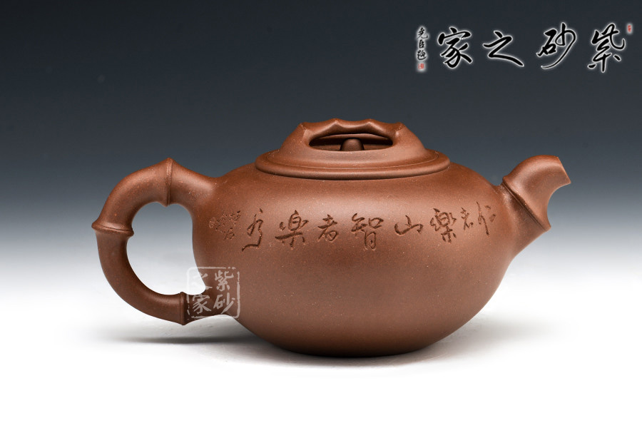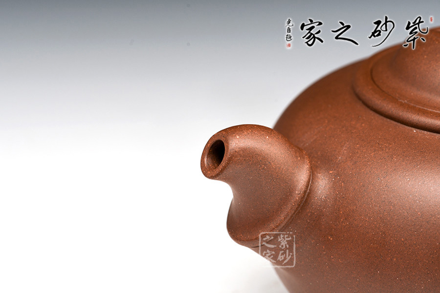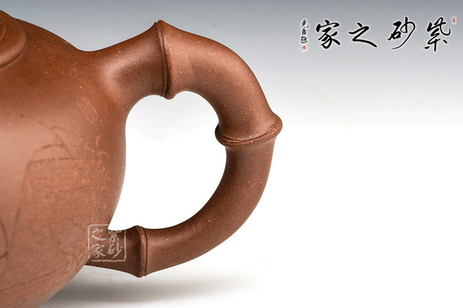 當(dāng)今紫砂藝人以竹為造型題材創(chuàng)作的壺式較為廣泛,文人氣息、藝術(shù)感強(qiáng)。此壺圓潤飽滿的扁圓身,流、鈕、鋬飾以竹節(jié)狀,蜿蜒延伸,渾厚內(nèi)蘊(yùn)。尤其壺鈕設(shè)計(jì)新穎別致,極為少見,儀態(tài)稚秀。全器簡練渾厚,泥料罕見,工藝精湛,宛若天成。