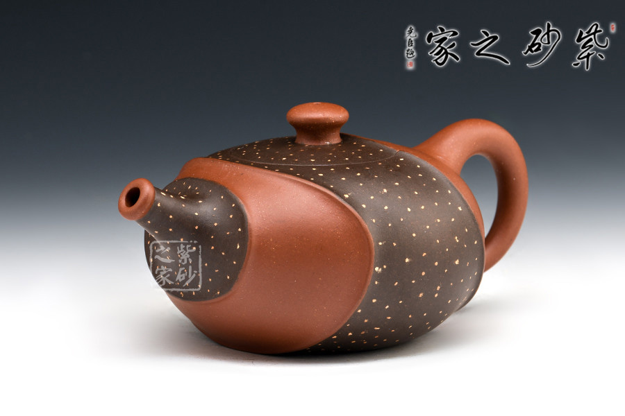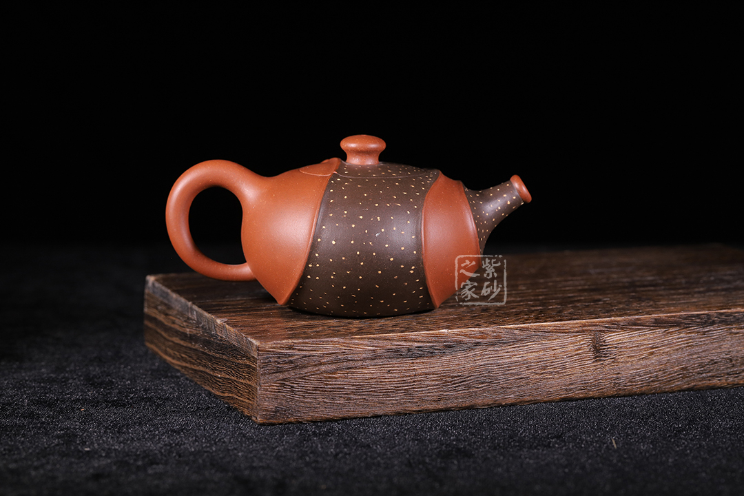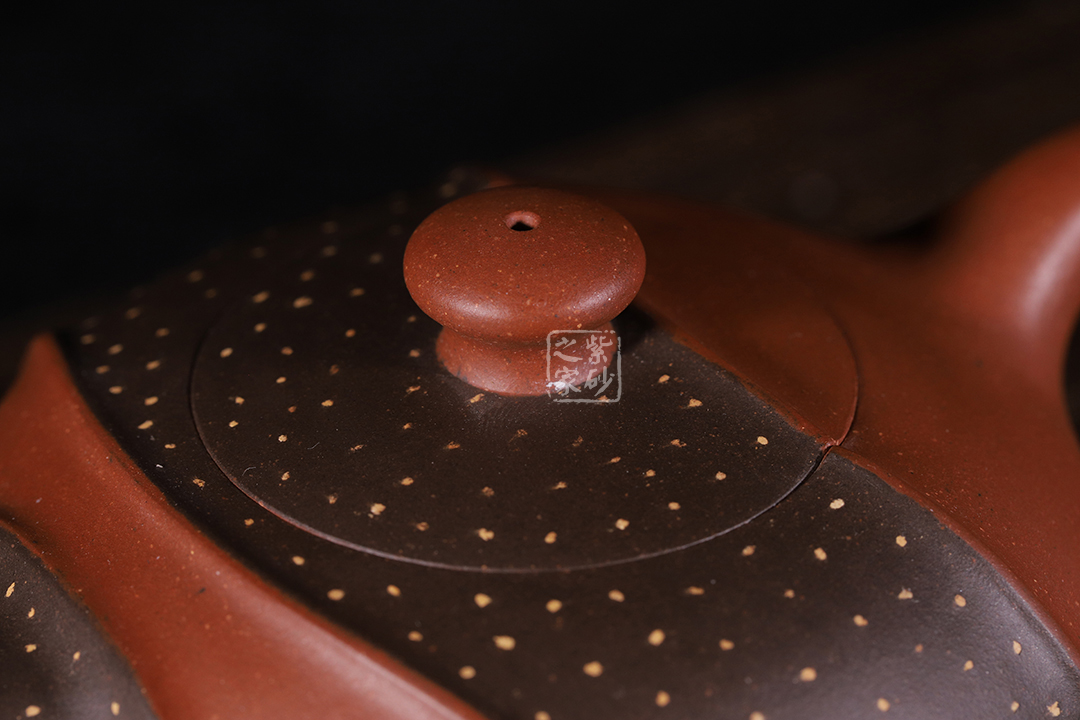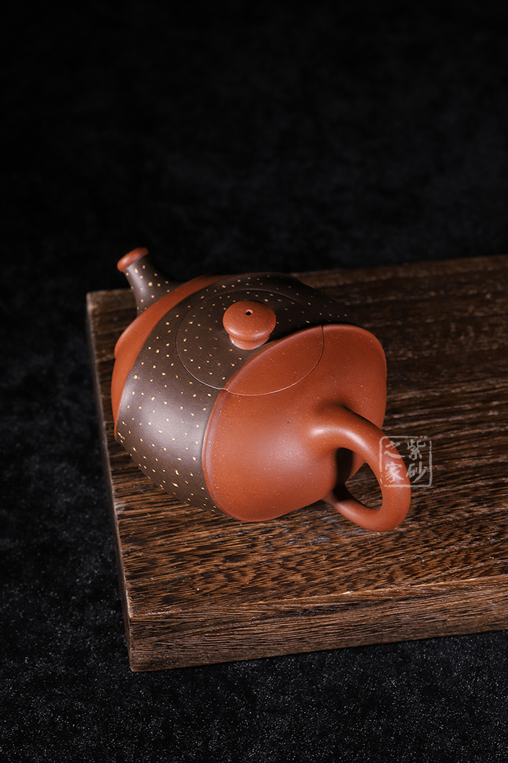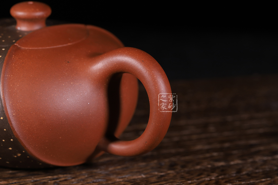 此壺非常特別,充滿個(gè)性,雙色環(huán)繞,相映成趣,從壺嘴延伸至握把。細(xì)節(jié)處理十分細(xì)膩,線條曲折而有規(guī)律,整體和諧統(tǒng)一。鋪沙工藝,讓壺身布滿點(diǎn)點(diǎn)金星,極具“珠粒隱現(xiàn),光閃奪目”之感。