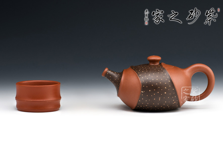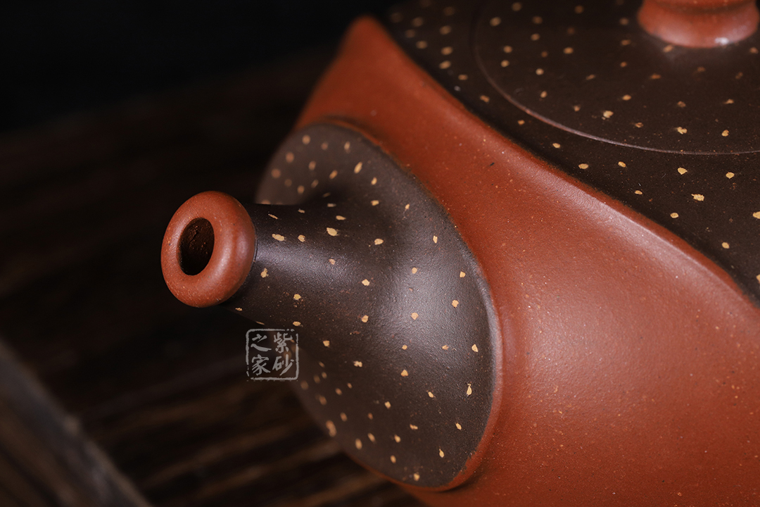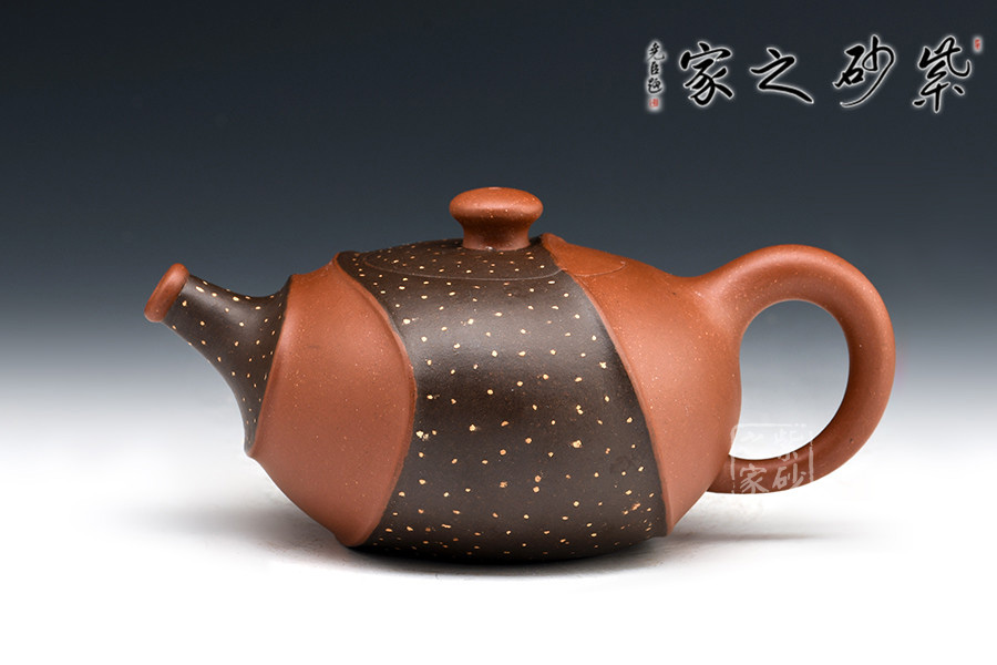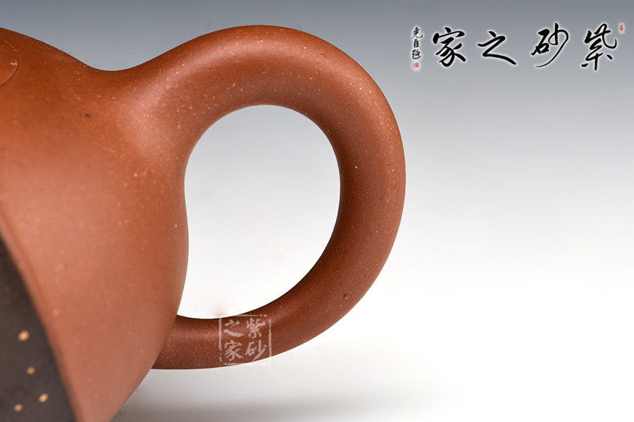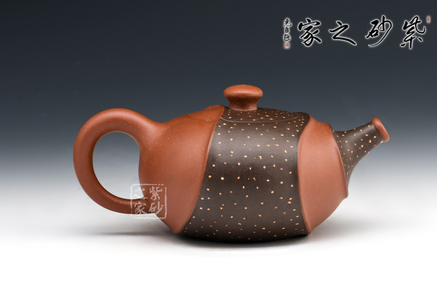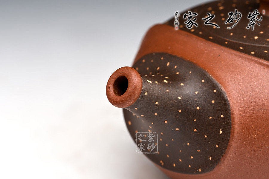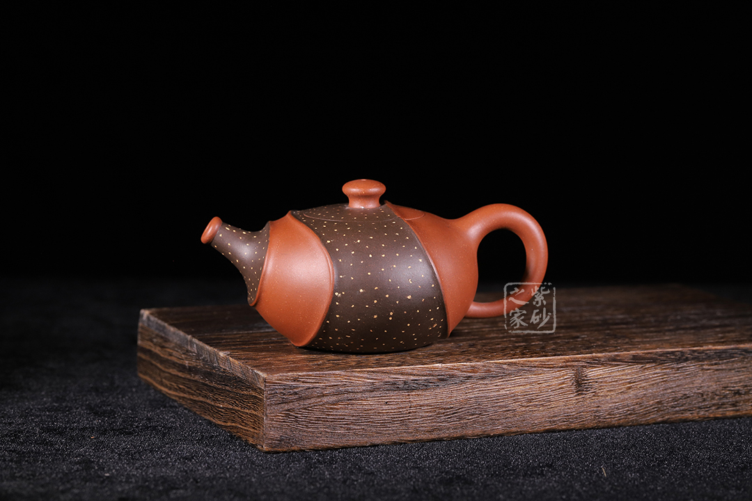 此壺非常特別,充滿個(gè)性,雙色環(huán)繞,相映成趣,從壺嘴延伸至握把。細(xì)節(jié)處理十分細(xì)膩,線條曲折而有規(guī)律,整體和諧統(tǒng)一。鋪沙工藝,讓壺身布滿點(diǎn)點(diǎn)金星,極具“珠粒隱現(xiàn),光閃奪目”之感。