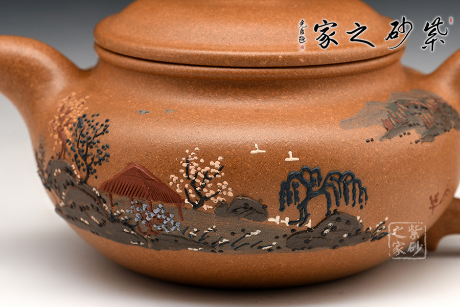 A面: 裝飾: 泥繪山水 裝飾者:萬菊芬 裝飾內(nèi)容: 小亭佇立,樹環(huán)繞在旁,水中有輕舟,頂上有飛鳥。