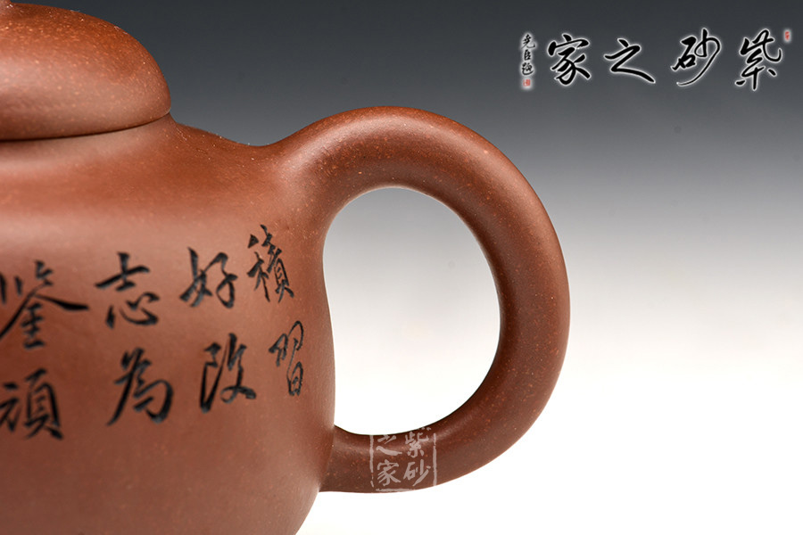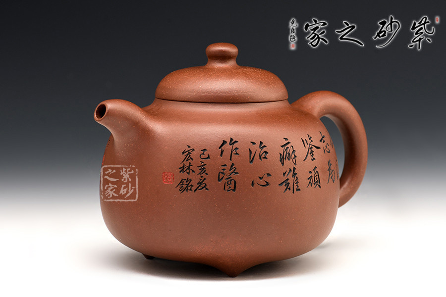 壺呈圓腹、下寬上收;短曲流、環(huán)狀柄;乳鼎鈕、三乳足,故也稱「三足乳鼎壺」。整壺豐滿、圓潤;線條挺括、流暢;色澤溫潤、細膩。壺身形體飽滿、渾圓如珠、光滑細致;壺嘴、壺把、壺鈕與壺身搭配協(xié)調(diào)、比例勻稱,壺嘴出水有力,壺把力度感強,壺蓋設(shè)計豐腴,口蓋嚴密;各部銜接不見痕跡、光滑自然、渾然一體,流暢的線條強化了律動的視覺效果。
