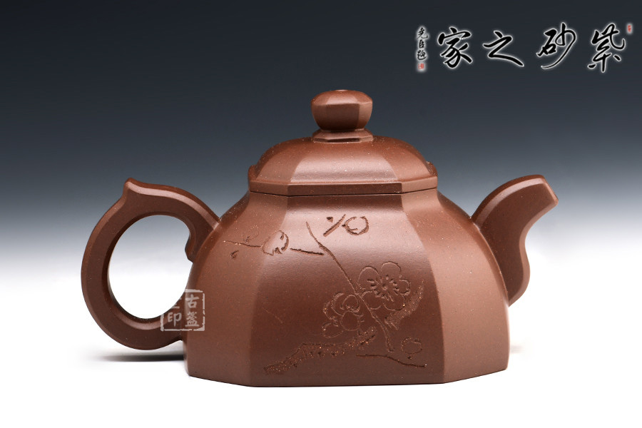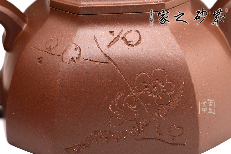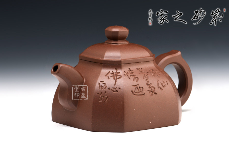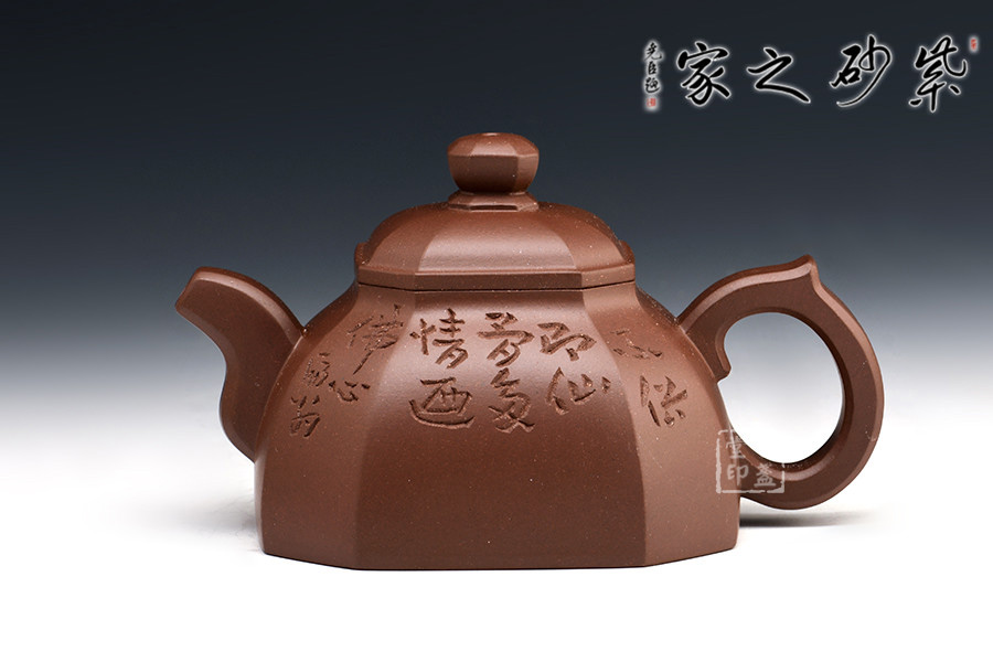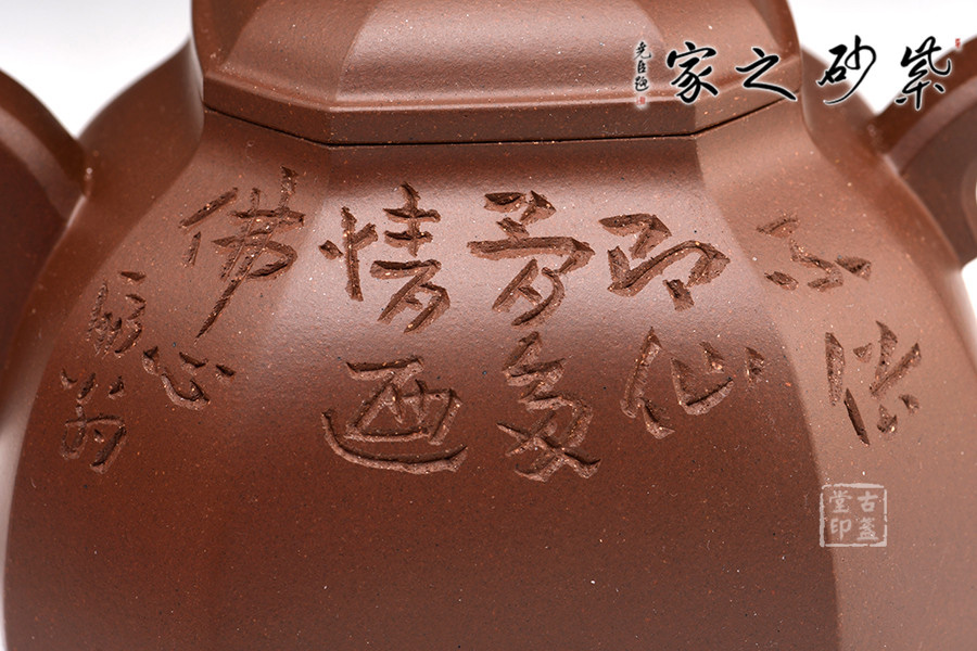 光貨離不開裝飾。俗話說“壺隨字貴,字隨壺傳”:光壺不刻字,就是一把光壺;壺上面刻了大師、名人的字,一把壺的含金量就高了,收藏價值就更高,升值潛力就更大。王福君與中國工藝美術(shù)大師譚泉海合作最多,其次是徐安碧、鮑志強、毛國強(均為中國工藝美術(shù)大師、中國陶瓷藝術(shù)大師)。