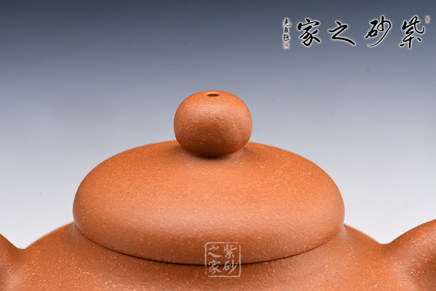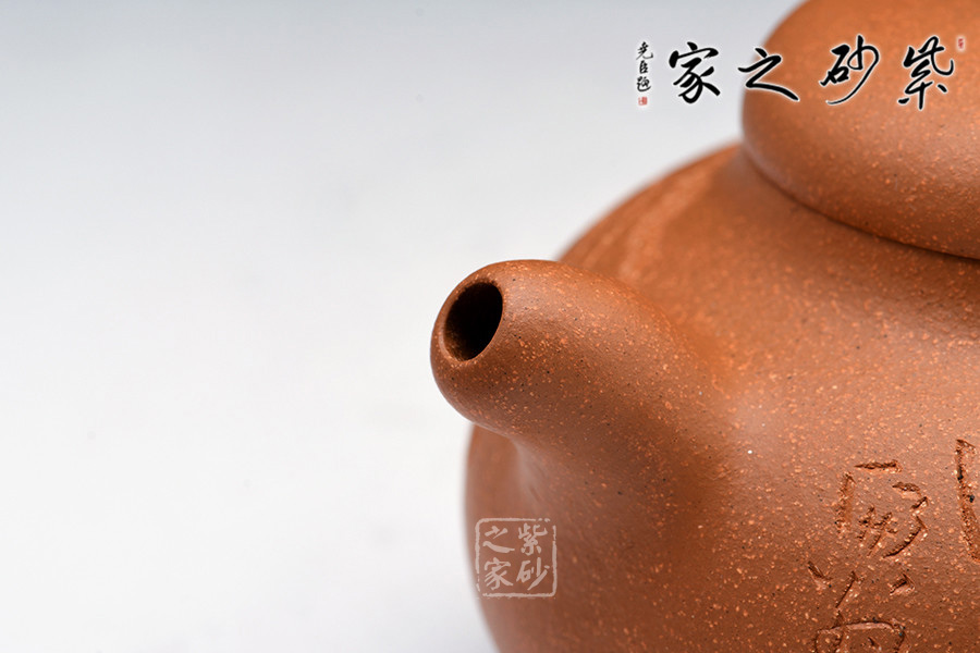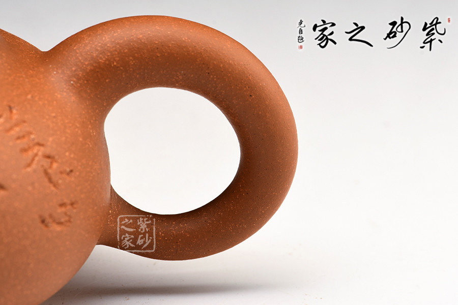 壺身為扁圓球型,線條飽滿,輪廓柔和。壺底加圈足,和壺頸部上下對應(yīng),優(yōu)雅氣韻由此頓生。蓋面飽滿圓潤,與整壺猶如一體,蓋上圓珠壺鈕圓滑可愛,精妙可人。壺把和壺嘴的線條非常明朗,與壺身相比似有些過于清晰,但正是因此,此壺特別的味道才更加濃厚。
