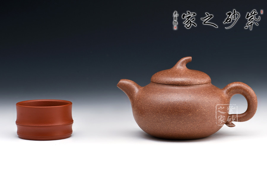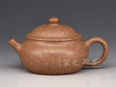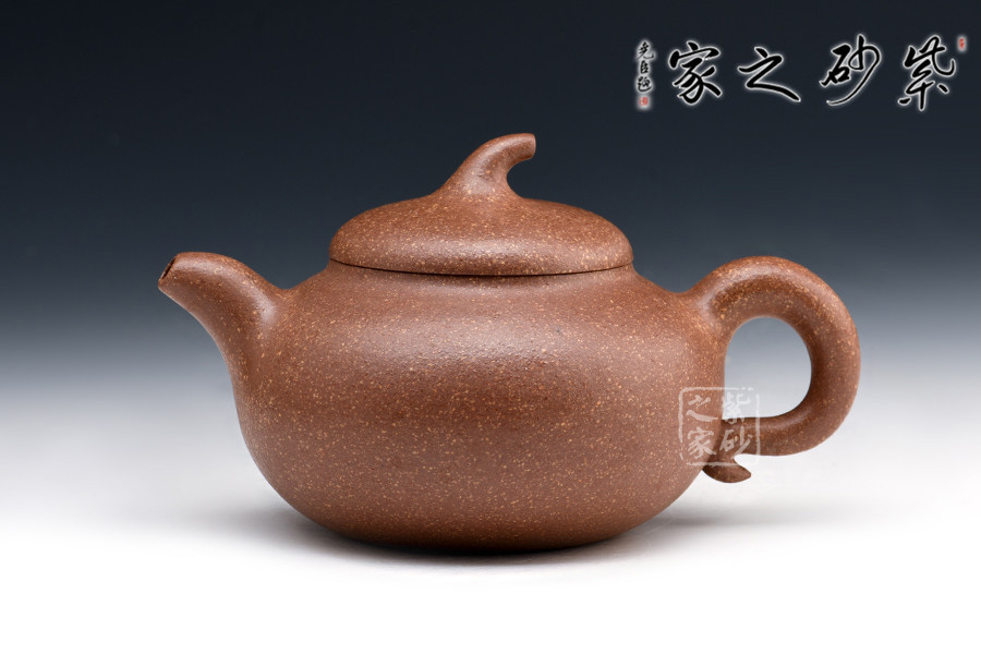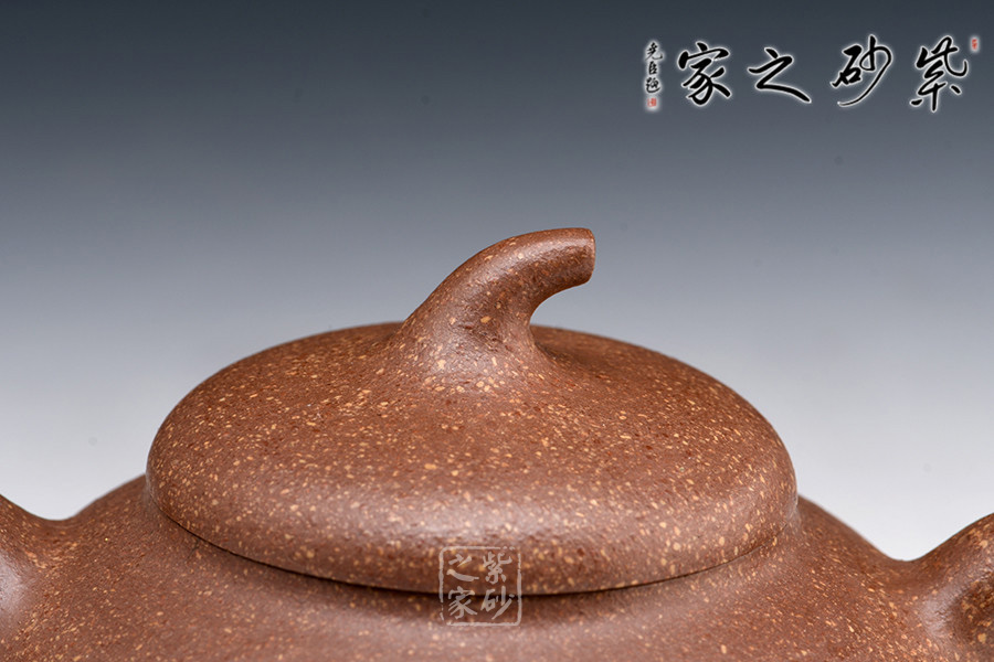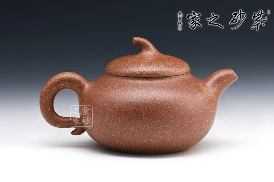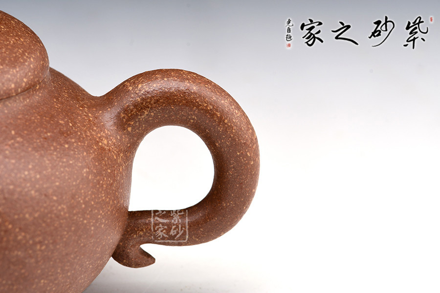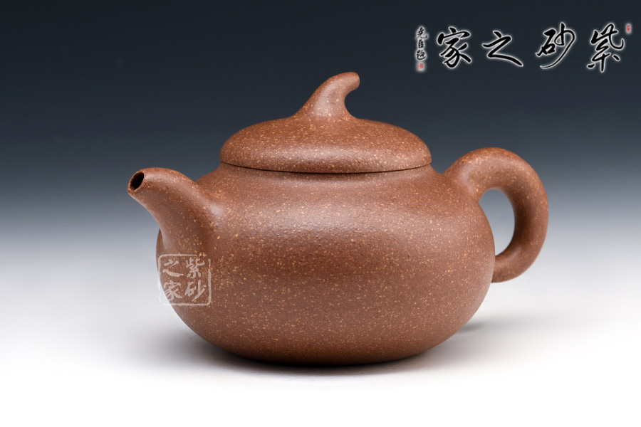 通體不著點(diǎn)滴筆墨,僅以造型、材質(zhì)示人,其光華內(nèi)斂,有丈夫清高內(nèi)斂之氣,令觀者叫絕。渾圓素樸的壺身造型,淳樸自然,大巧若拙。圓弧形壺蓋,壺紐似蒂,二彎壺流、耳狀壺把,帶垂耳。