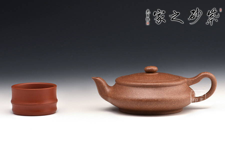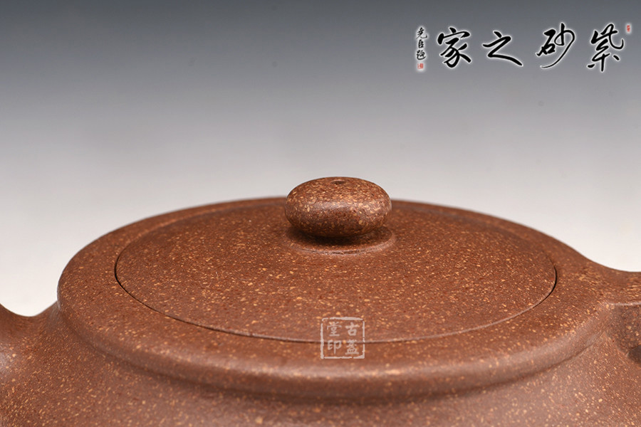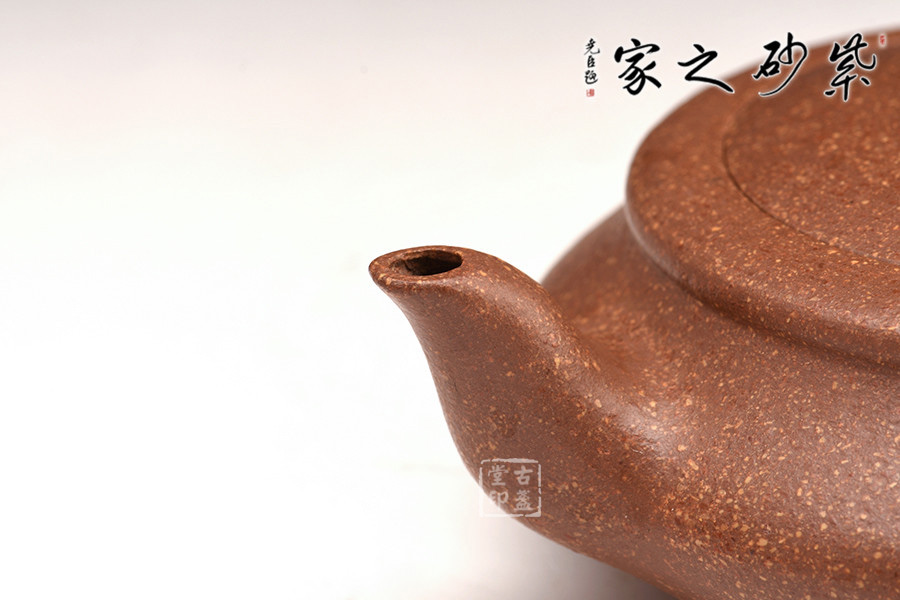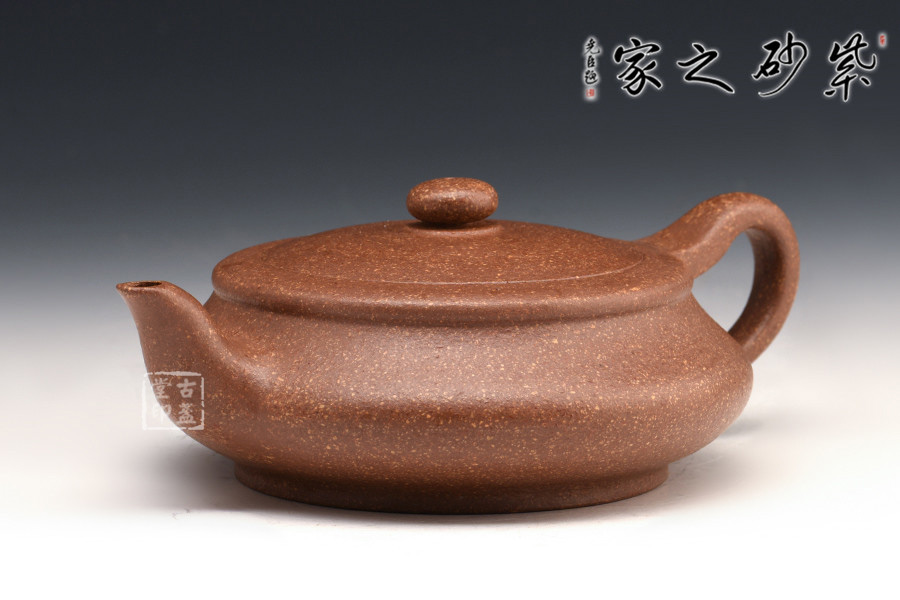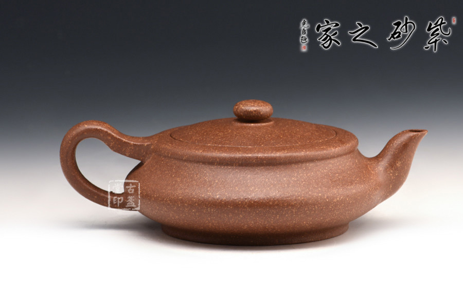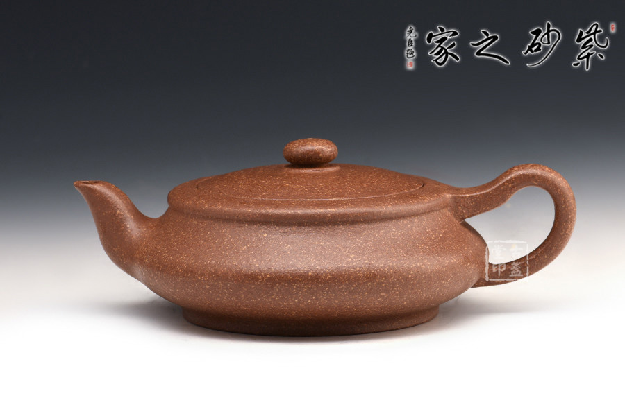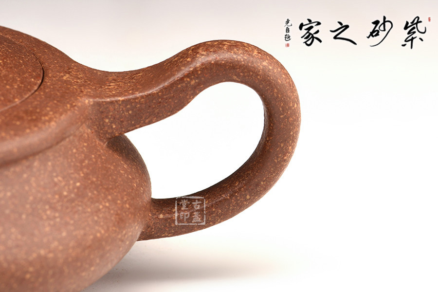 此壺為砂壺形制中的扁型,藝趣盎然。嵌蓋、扁圓鈕、彎流、環(huán)柄、圈足,姿態(tài)優(yōu)美,器形線面屈曲和諧,寓瀟灑于織巧中,形隨扁而氣卻昂,剛?cè)岵?jì),神品也。扁圓的器型,給人一種虛懷若谷,逍遙自在的感覺(jué),令人玩味不盡。