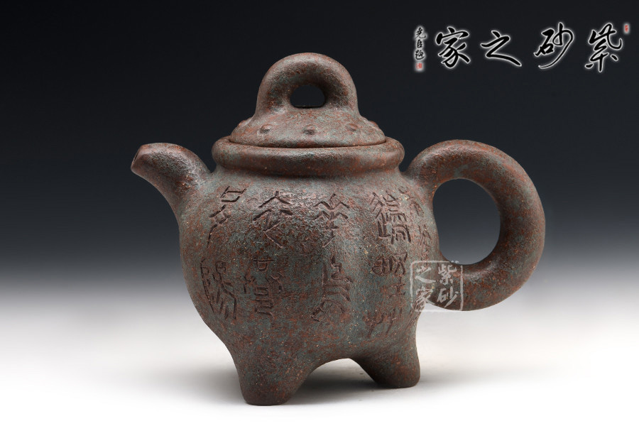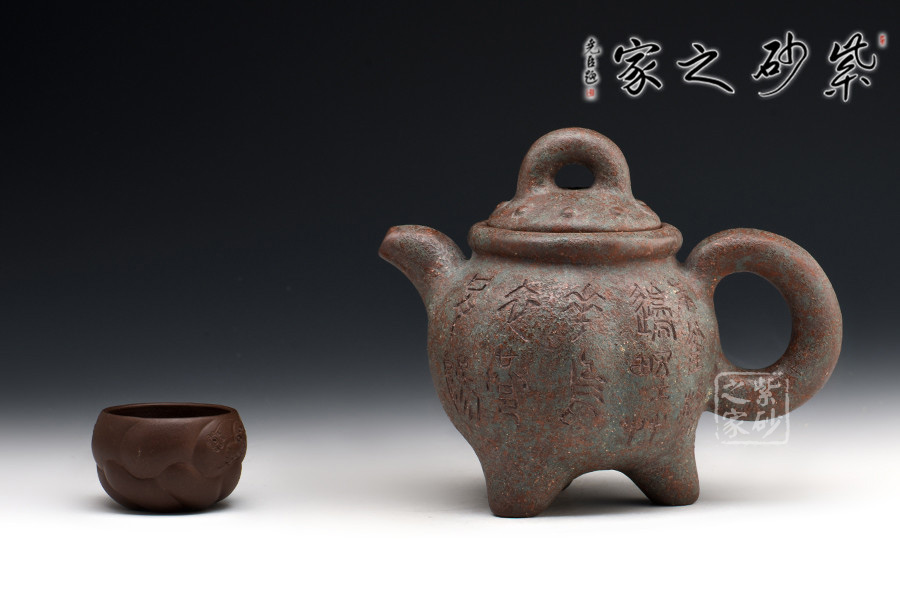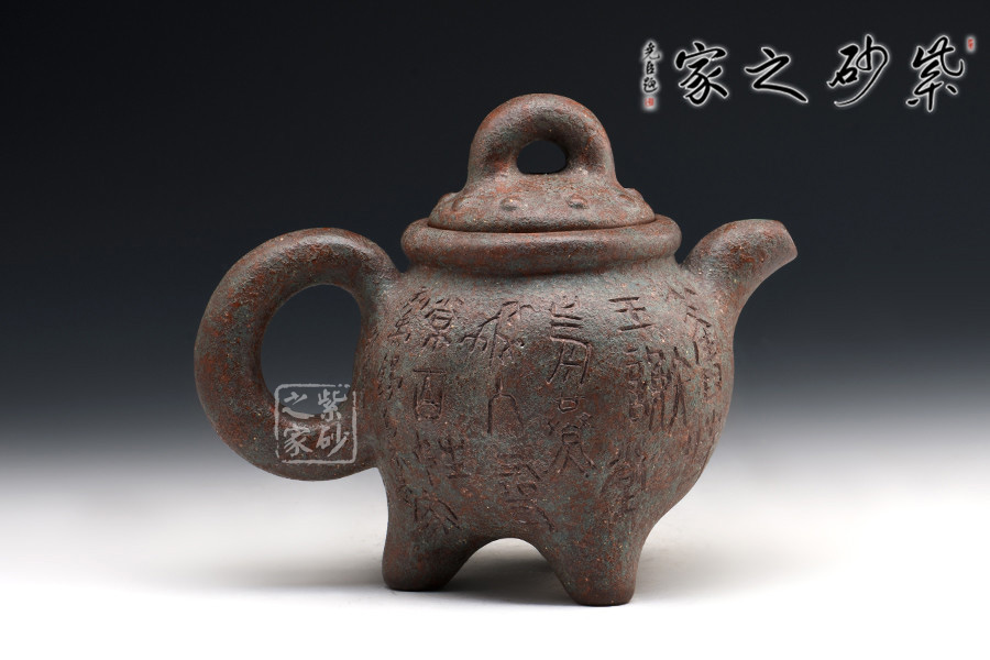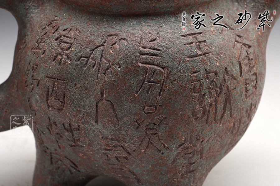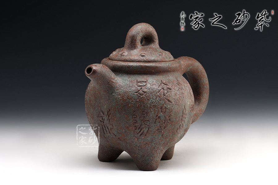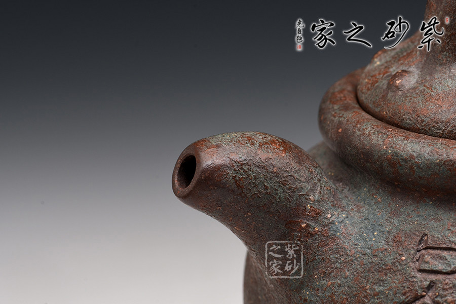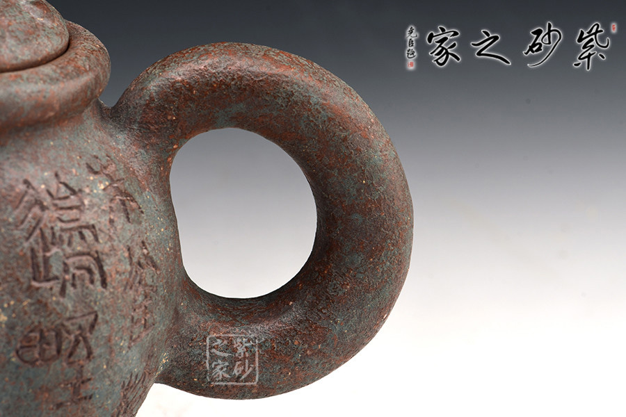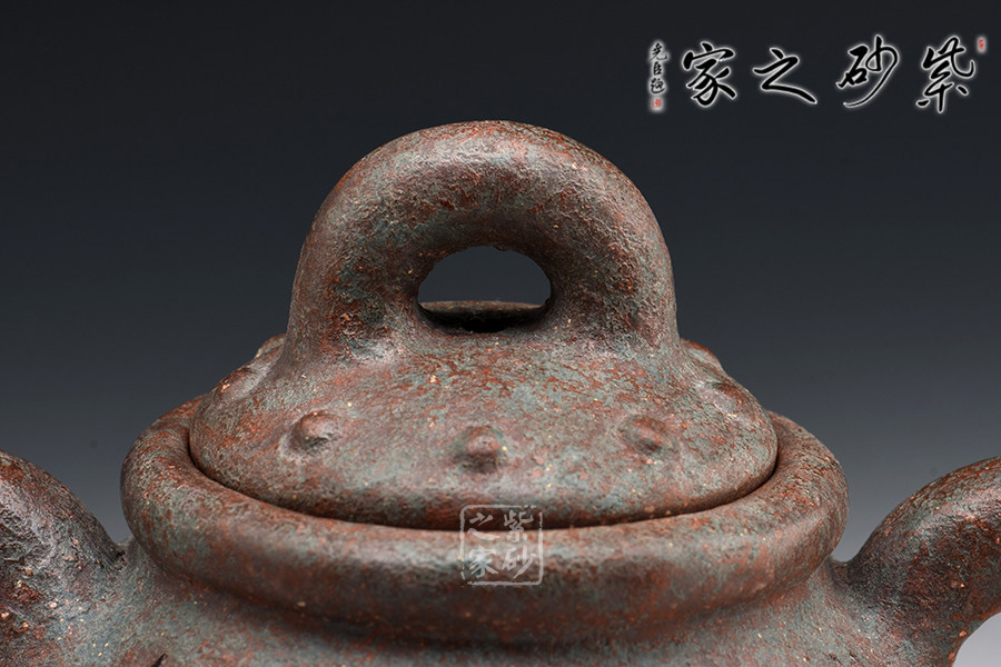 此壺作古代青銅鼎的風(fēng)格設(shè)計,不管是造型的古典還是泥料的運用,都使此壺呈現(xiàn)出一種歷經(jīng)時代滄桑洗禮的風(fēng)貌,器身顯銹色青翠色,可謂端正古樸,氣韻穩(wěn)重,殊為難得。