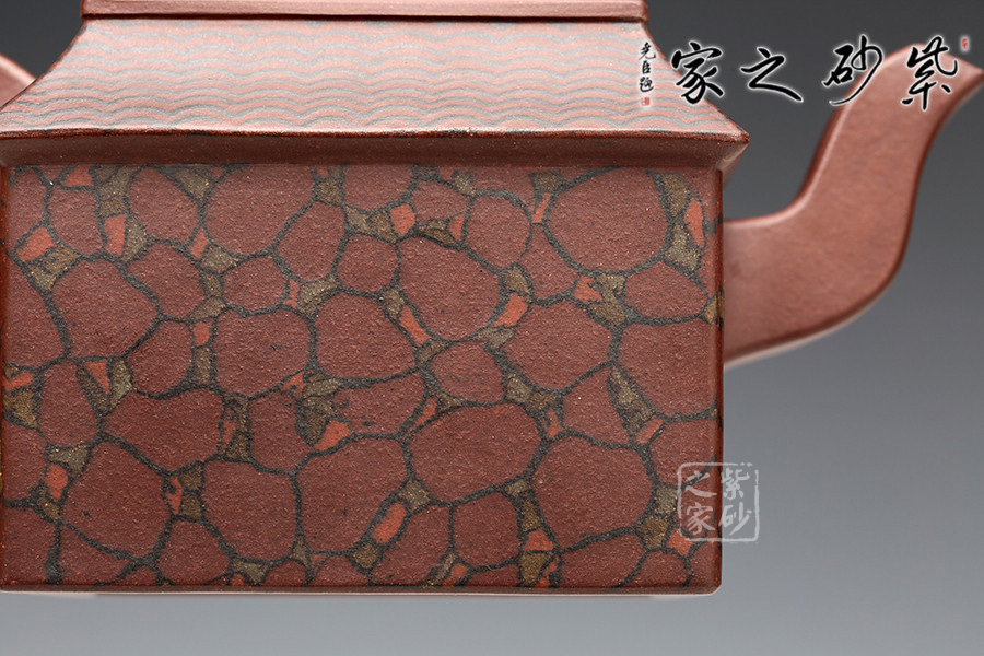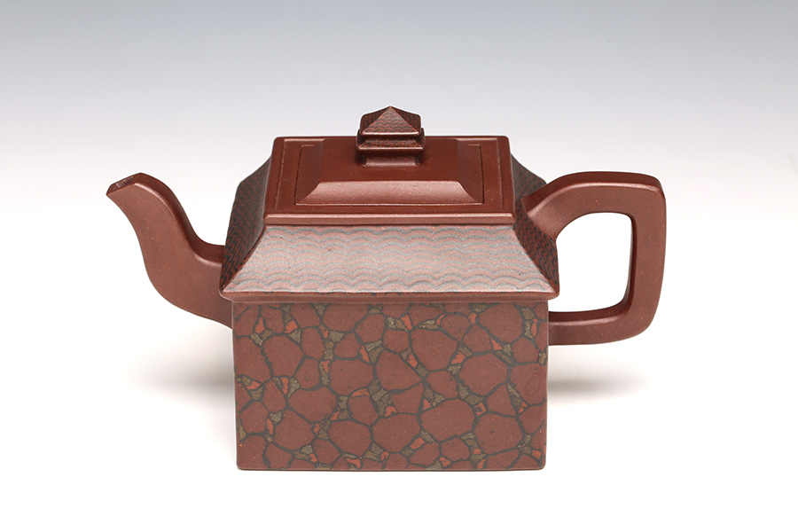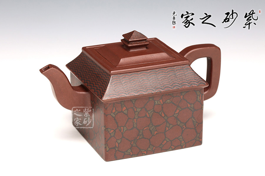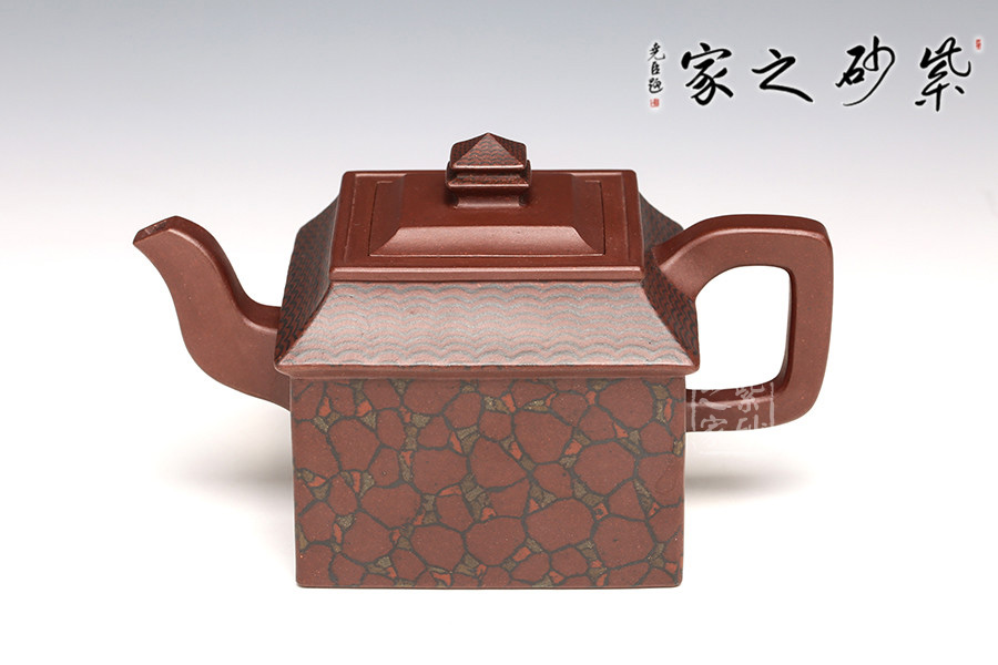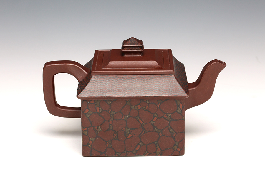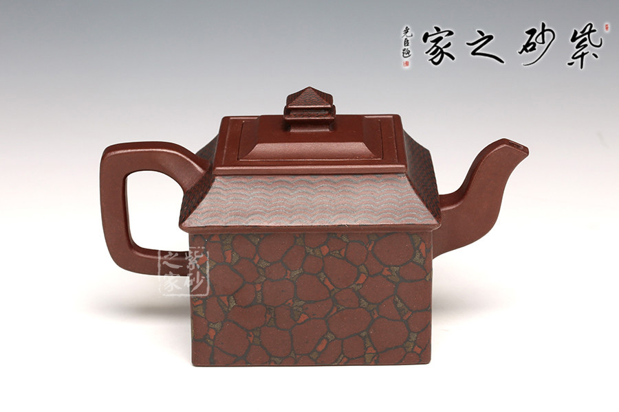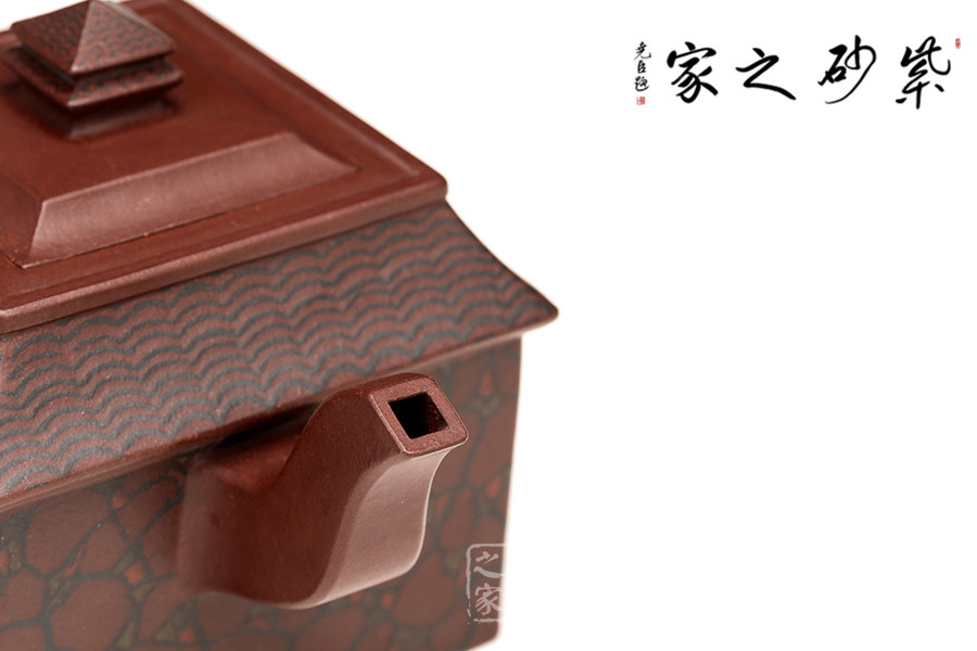 此壺取寶殿建筑為形,壺鈕作寶殿屋頂,氣勢端莊,周正而欲見耀揚(yáng)之威嚴(yán)。壺身呈四方體,斜肩作屋瓦,敦實(shí)端莊。四方三彎流,胥出自然,四方壺把,剛勁有力。壺身下部與斜肩面作絞泥狀修飾,呈屋瓦墻磚紋樣,只限一眼,便得光彩奪目,氣勢如虹。