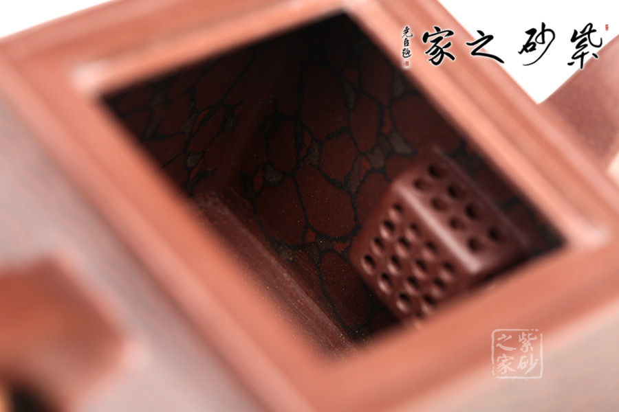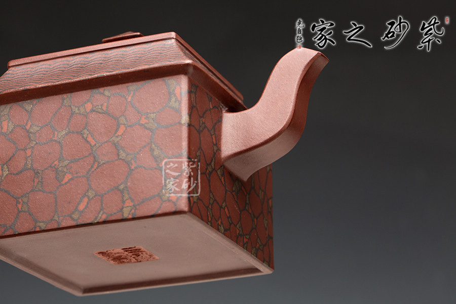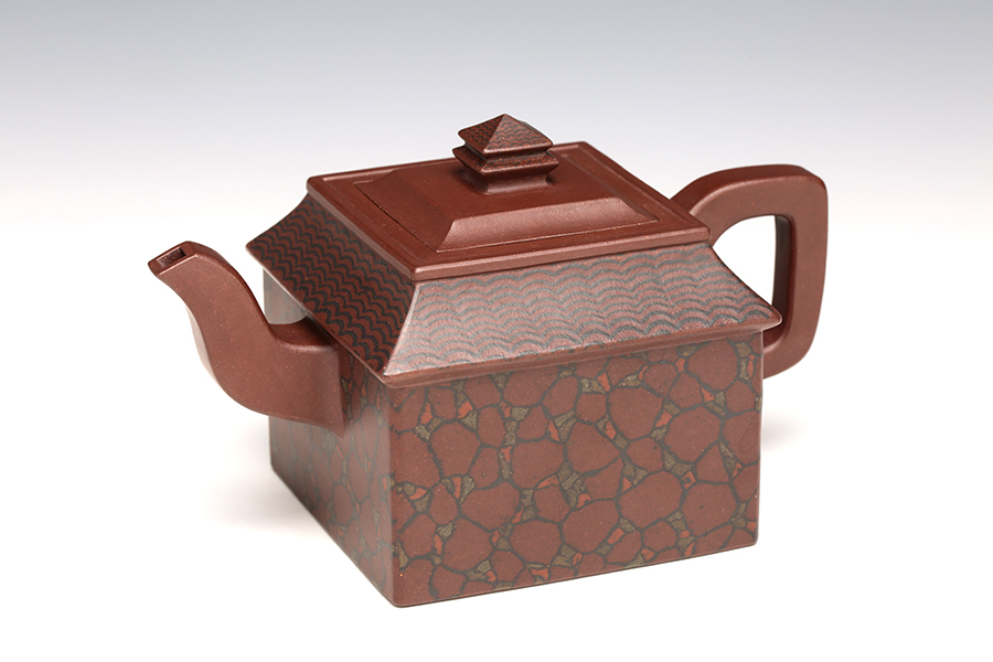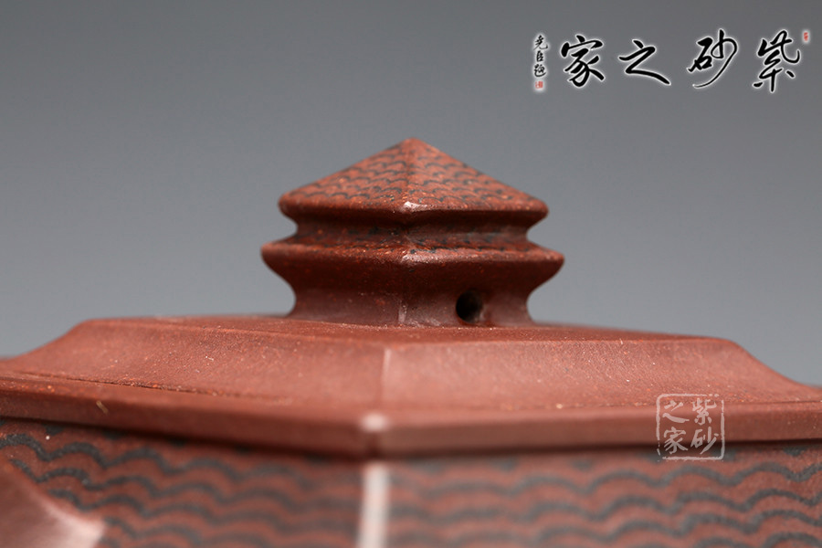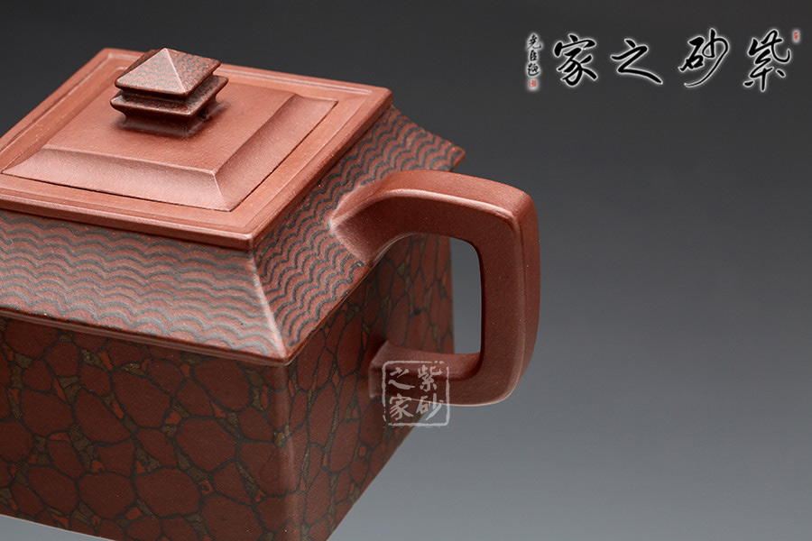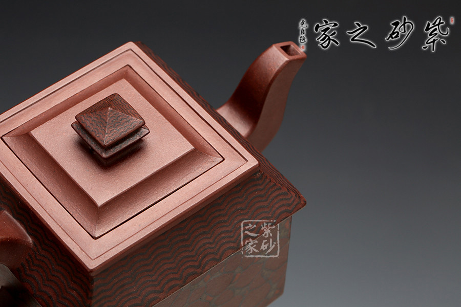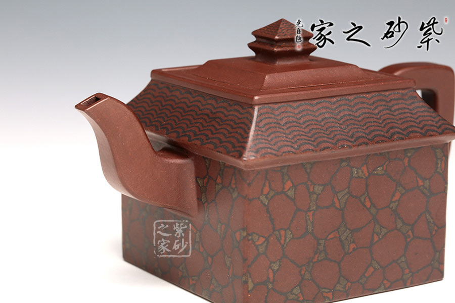 此壺取寶殿建筑為形,壺鈕作寶殿屋頂,氣勢端莊,周正而欲見耀揚(yáng)之威嚴(yán)。壺身呈四方體,斜肩作屋瓦,敦實(shí)端莊。四方三彎流,胥出自然,四方壺把,剛勁有力。壺身下部與斜肩面作絞泥狀修飾,呈屋瓦墻磚紋樣,只限一眼,便得光彩奪目,氣勢如虹。