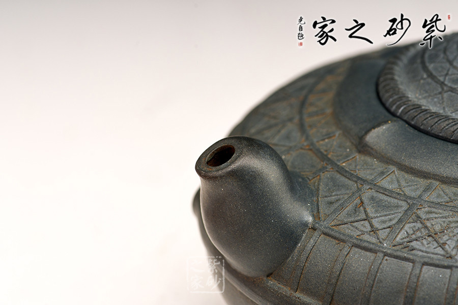 竹編形體移植到紫砂壺,篾能縱橫穿梭,嘴、把、蓋、鈕與壺身整體比例協(xié)調(diào),泥料采用優(yōu)質(zhì)原礦綠泥,外形和色澤都能以假亂真,彰顯大師深厚功底。