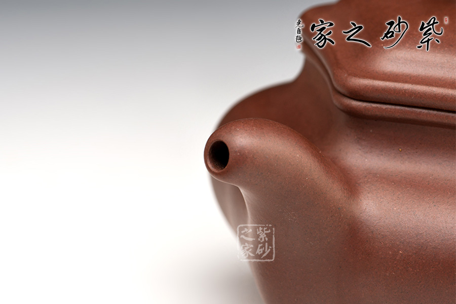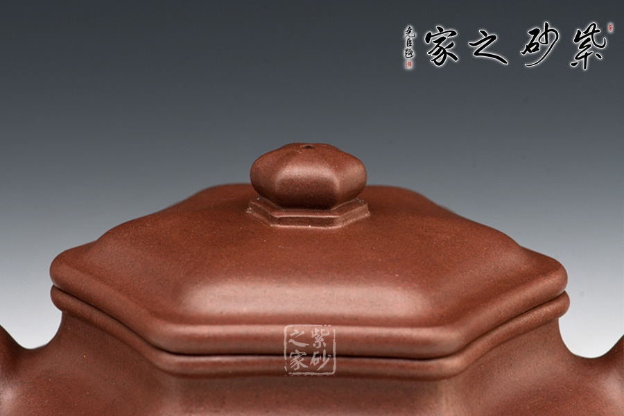此壺在傳統(tǒng)仿古壺的基礎(chǔ)上創(chuàng)新為方器造型,方中藏圓,線面挺括平正,輪廓線條分明。將方器的精髓都表現(xiàn)得淋離盡致,壺身與壺蓋緊密相連,而六方轉(zhuǎn)動(dòng)皆吻合,壺鈕與壺身相呼應(yīng),采用六方圓體造型,使紫砂壺的造型更加生動(dòng)、形象、活潑。