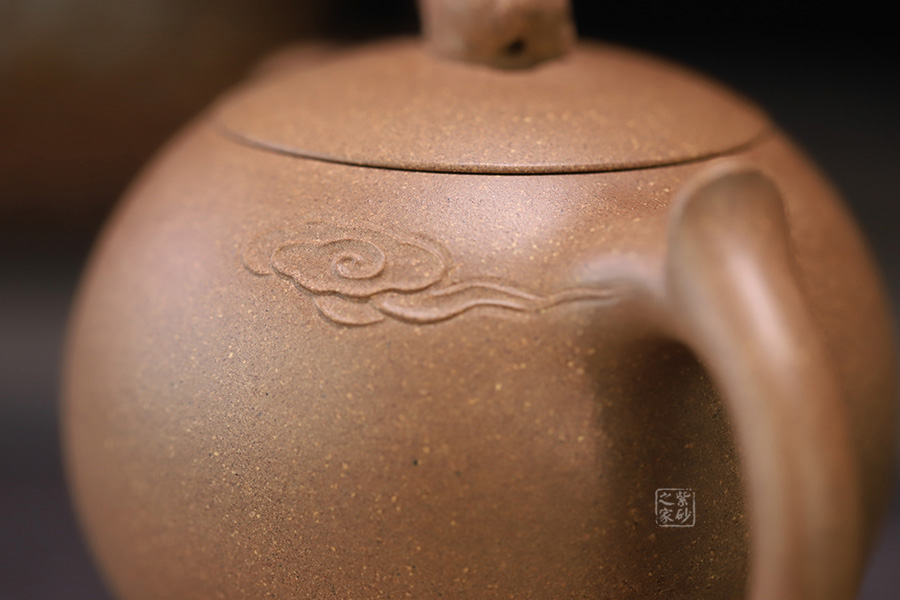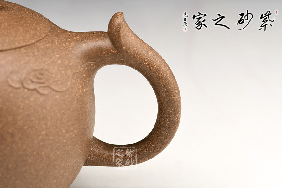 此壺器身由極精簡(jiǎn)的線(xiàn)面架構(gòu)成形,流線(xiàn)豐滿(mǎn)光潤(rùn),自然服帖,身蓋相連呈截蓋,底向里收斂。短嘴飛形把,加上壺身之上的云紋裝飾,顯示“平步青云”的風(fēng)姿。