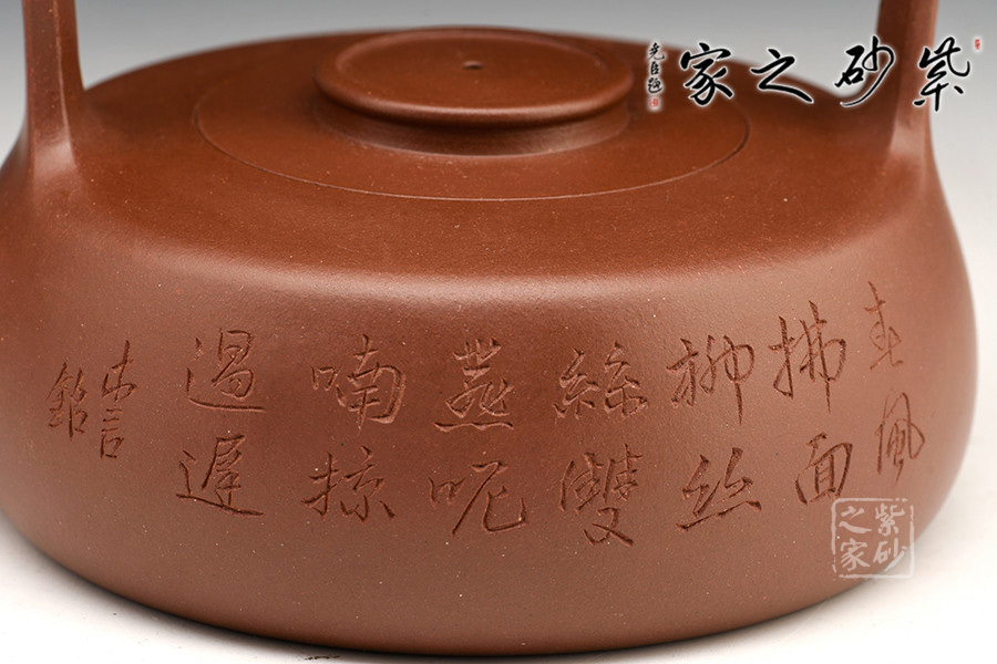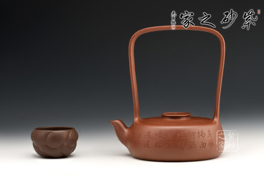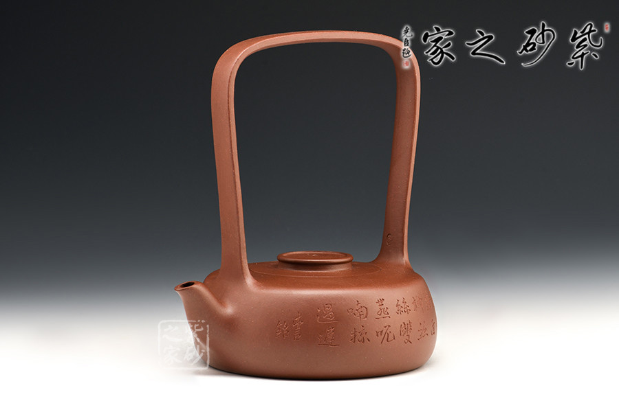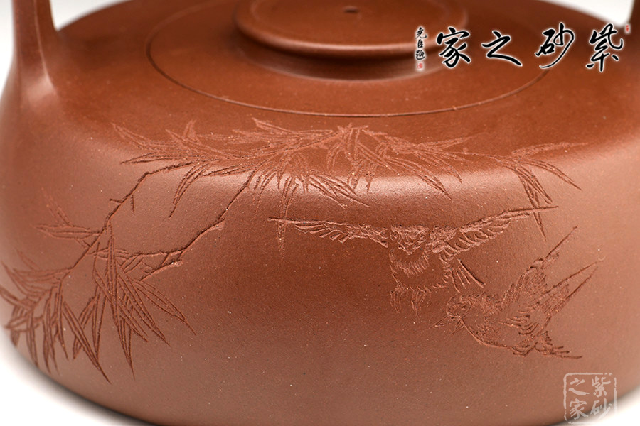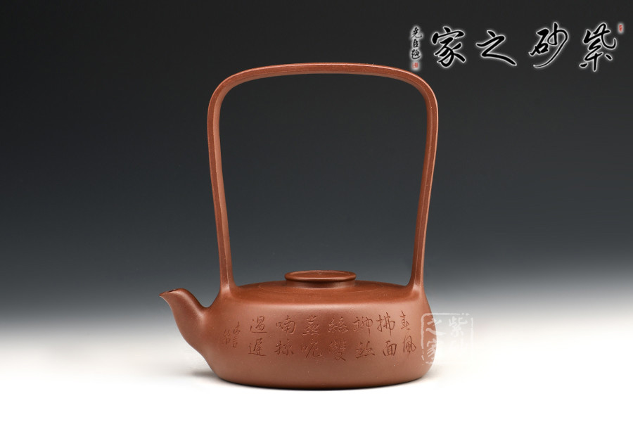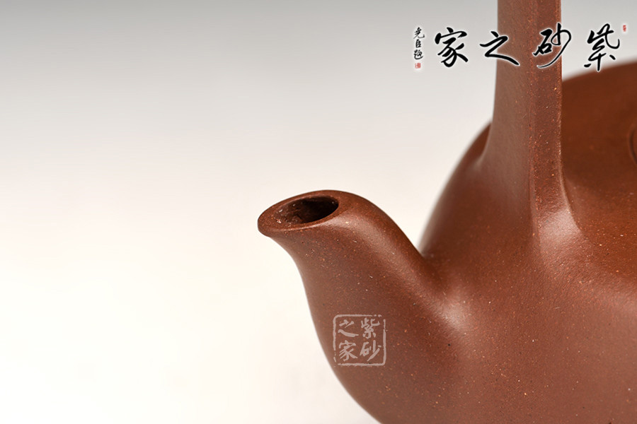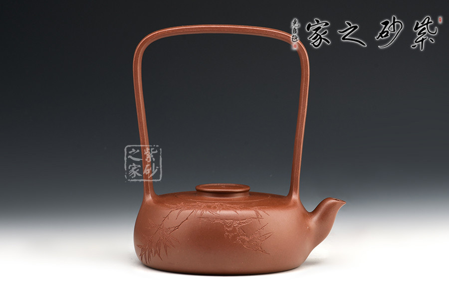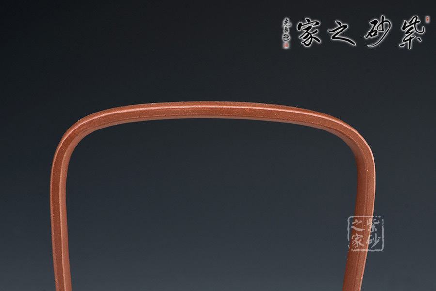 此創(chuàng)作精髓在于高而突出的提梁,動(dòng)勢(shì)飛揚(yáng),協(xié)調(diào)呼應(yīng)。從紫砂壺的工藝角度,提梁越高制作難度越大,需要制壺者對(duì)紫砂的泥性有絕高的把握。