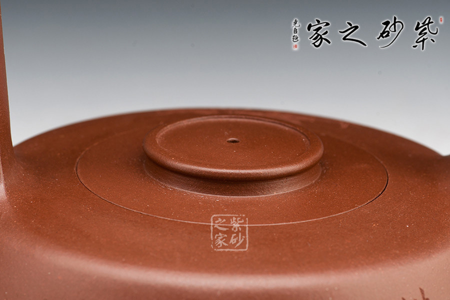 壺身扁圓似鼓,上部?jī)?nèi)收,嵌蓋、扁圓鈕與短彎流相呼應(yīng)。提梁順壺身肩部向上漸開(kāi),頂部與壺底勻稱(chēng)輝映,結(jié)構(gòu)嚴(yán)謹(jǐn)。超高的提梁和均扁的壺身完美協(xié)調(diào),虛實(shí)處理得恰到好處,線面簡(jiǎn)潔光素,大美無(wú)言。
