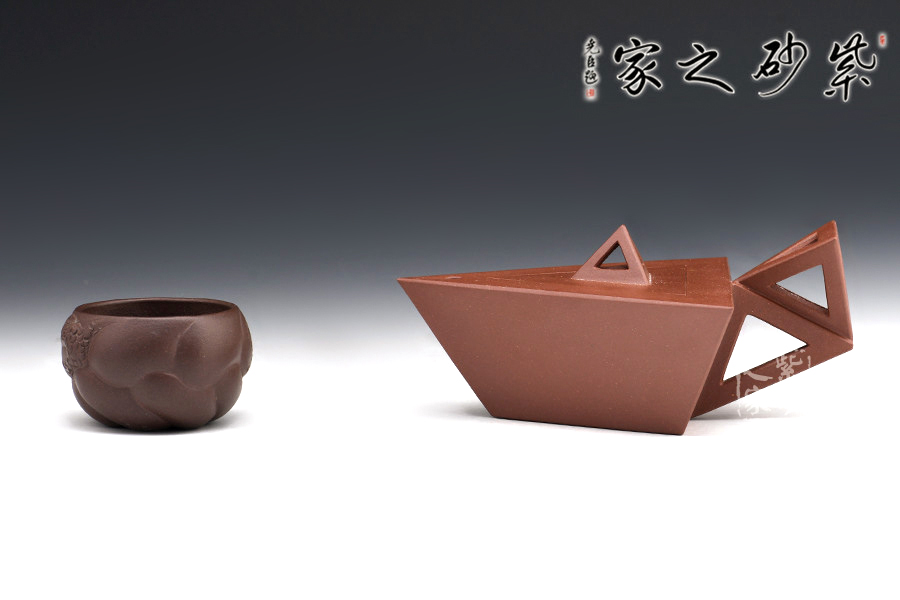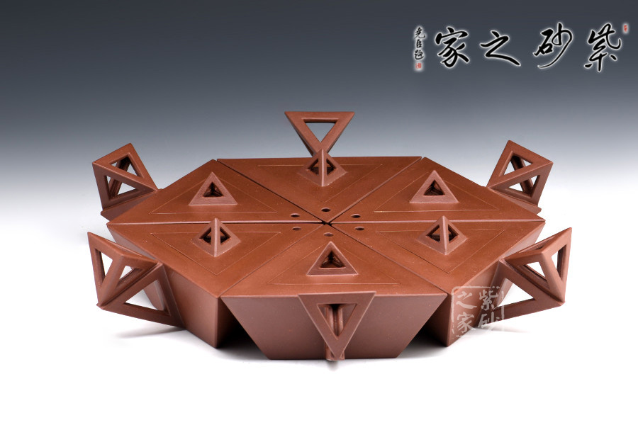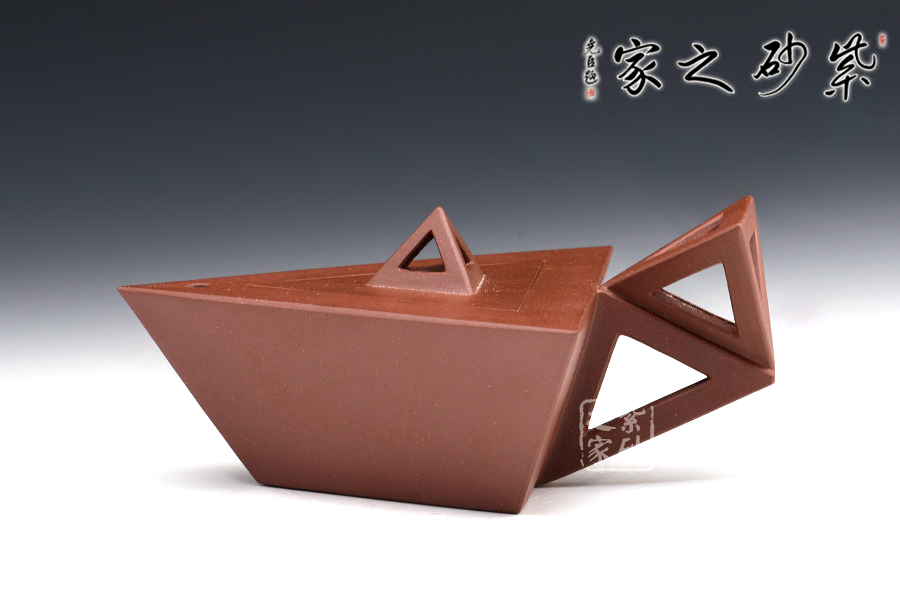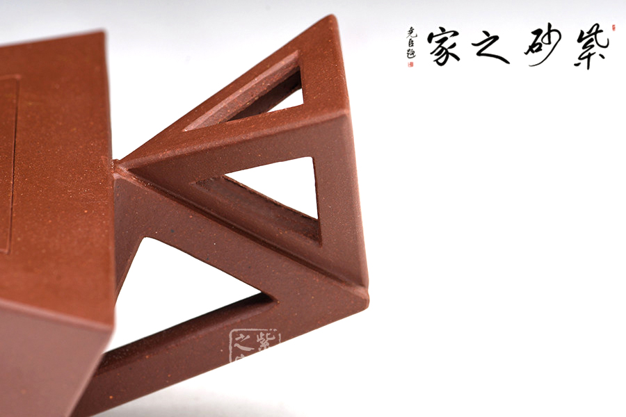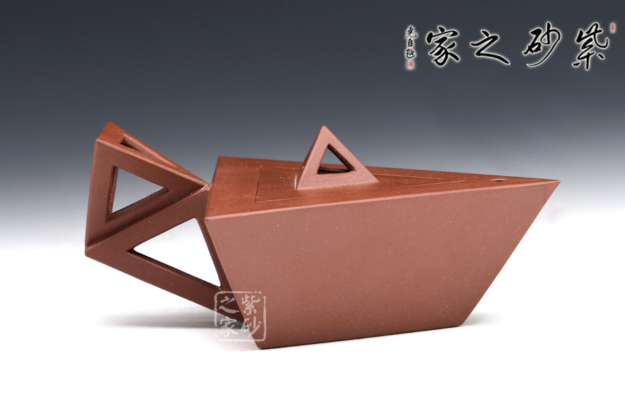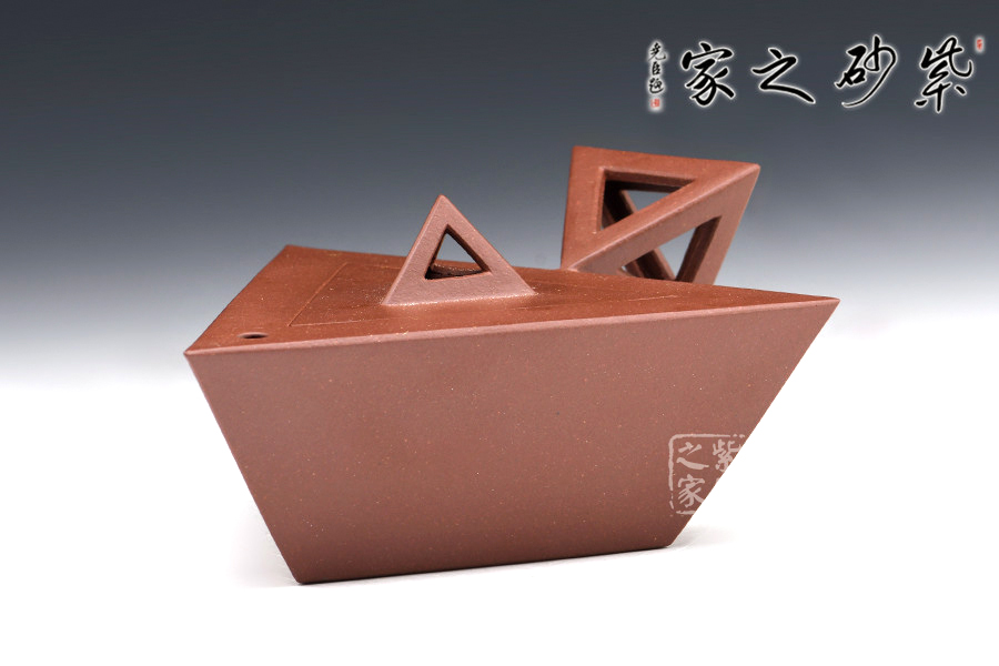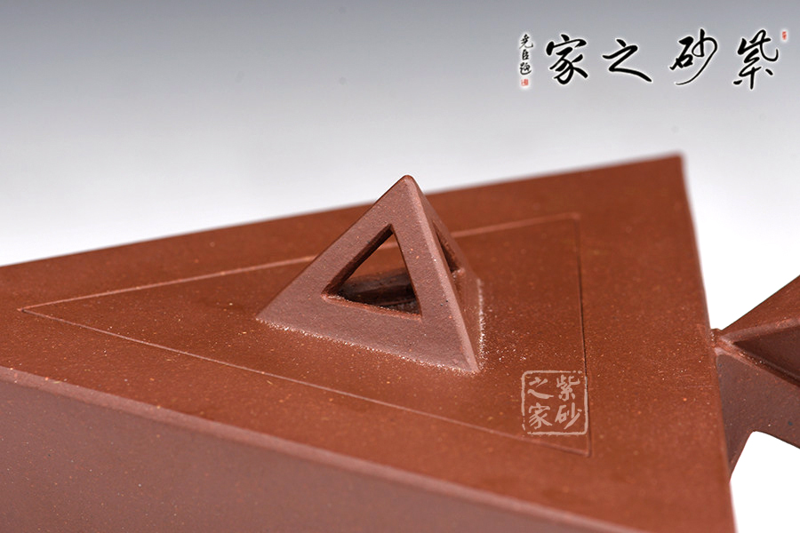 以三角形為元素。壺身采用大的等邊三角形設計而成,壺把是用一個等邊鏤空三角體和一個等腰三角形組合設計而成。壺鈕采用一個小的等邊鏤空三角體設計而成。壺鈕中間加了一個小圓球,增加了整個壺的生動和趣味性。