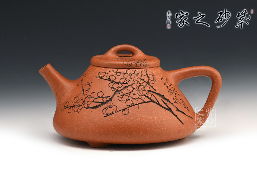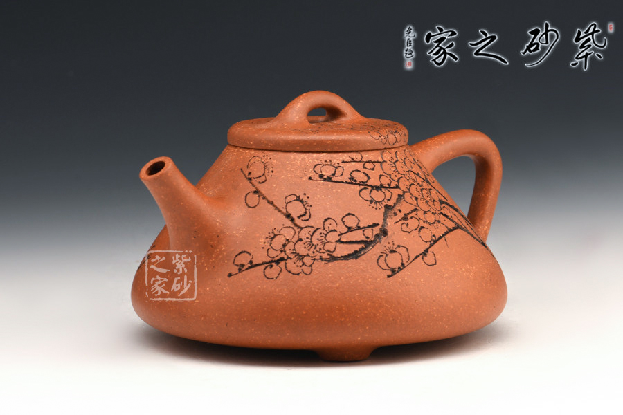子冶石瓢的造型,大約是道光時期曼生手繪首創(chuàng)的壺式,是文人與陶藝的妙合,它蘊(yùn)涵了豐富內(nèi)涵的人文意趣。從壺式上看,壺形上小下大,重心下垂,造型沉穩(wěn),壺嘴為矮而有力的直筒形,出水暢順,極速有力。壺身呈“金字塔”式,壺流、壺口、壺把三點(diǎn)形成水平直線,符合科學(xué)性,觀賞端莊敦穆。