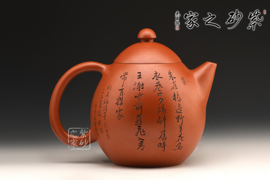 此壺器型甚大,直流斂口敦形,執(zhí)把倒把,圓弧下曲,壺鈕圓錐似覃菇。朱砂泥大器燒造難度甚高,成品甚少,此壺就屬其中精品,且壺身顆粒效果頗佳,造型結(jié)構(gòu)嚴(yán)謹(jǐn),比例協(xié)調(diào),為龍蛋壺式的典范造型。