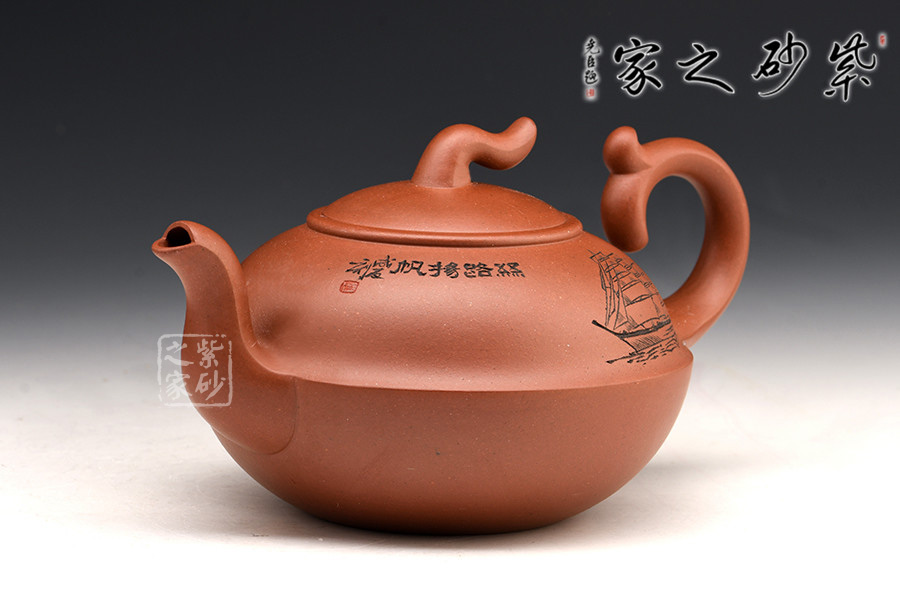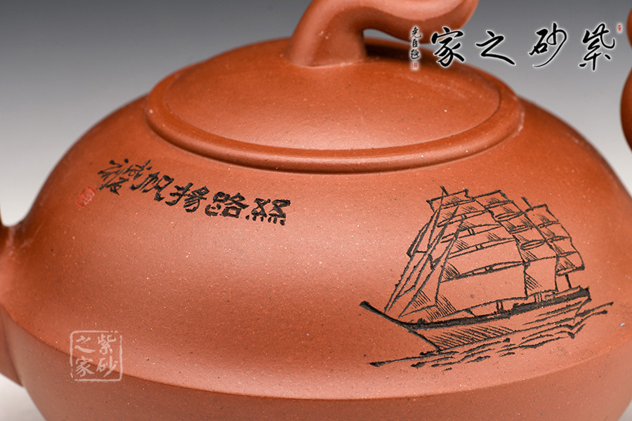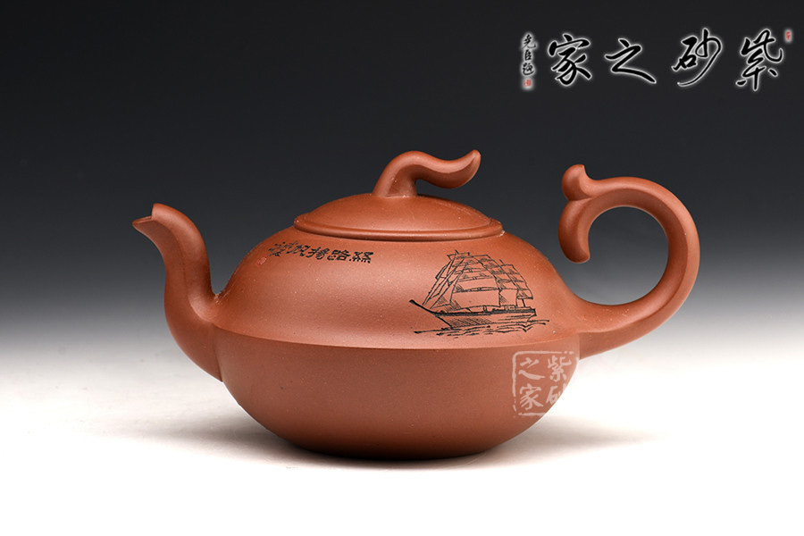 絲路揚(yáng)帆壺,壺身為球型,壺把和壺鈕是一朵浪花;壺嘴、壺身到壺把似飄帶相連,寓意“一帶一路”;壺身刻有帆船,以帆船為載體把全球經(jīng)濟(jì)連系在一體。
