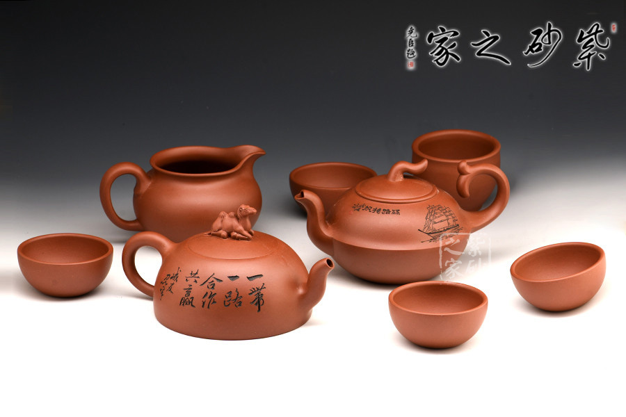 此作品為八件套,二壺六杯:壺,絲綢之路壺和絲路揚(yáng)帆壺;杯:公道杯、主人杯和四個(gè)客人杯。