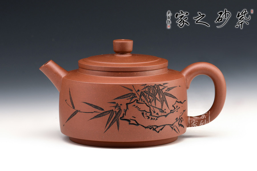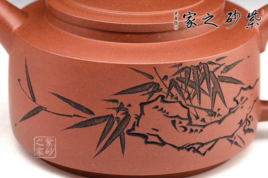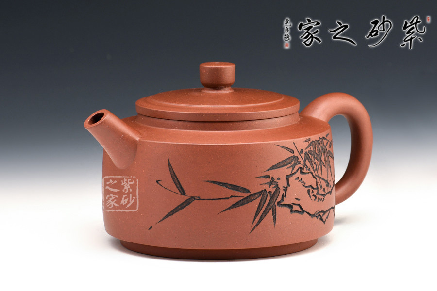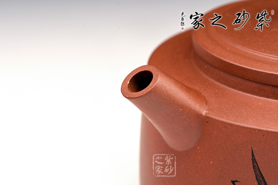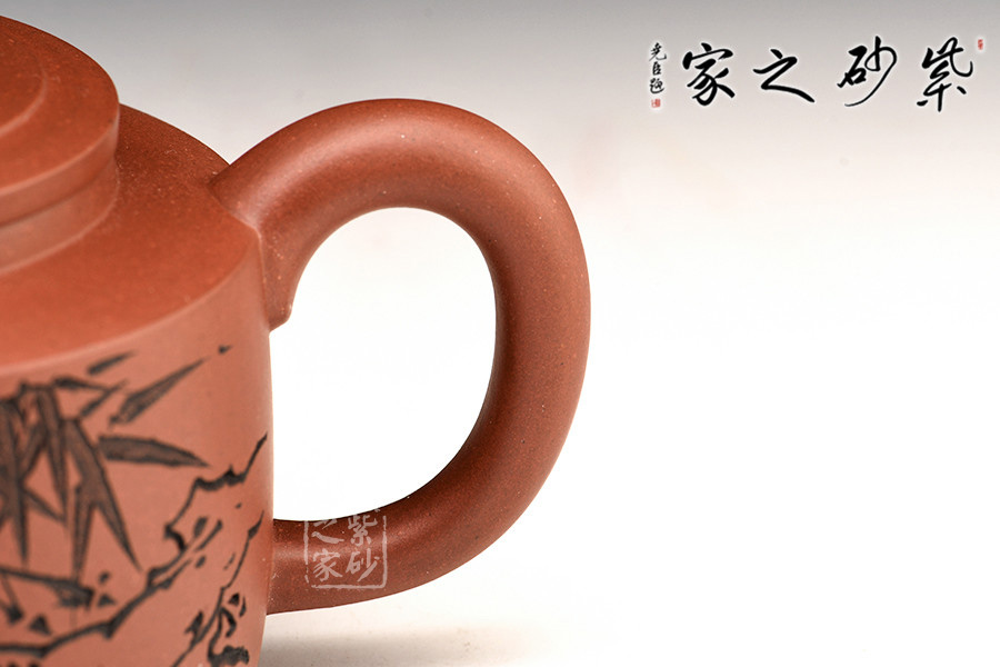 該筒形壺泥質(zhì)純正,胎色鮮明,器壁輕靈,美觀秀麗,同時(shí)給人一種敦厚穩(wěn)定之感。身筒圓鼓,壓蓋微隆,口蓋密合。扁圓柱形鈕與壺身呼應(yīng),直嘴耳型把,樸厚大方。整體素雅,加之壺身繪竹刻詞,氣格高古,極具中國味道。