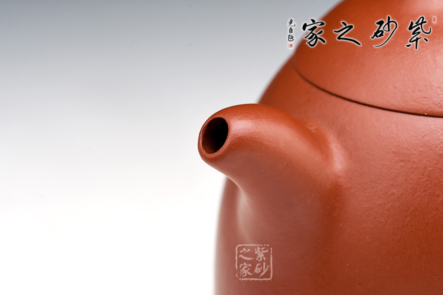 壺形似柱上部收斂,橋形鈕順著鐘形蓋面弧度拱起。短流向上微曲,力感十足。環(huán)耳形把手,半圓形截蓋,赭紅色澤溫和中正,形制樸素敦厚,態(tài)體光潤(rùn)優(yōu)美,線(xiàn)條流暢而規(guī)則,氣格古樸,穩(wěn)重沉著。