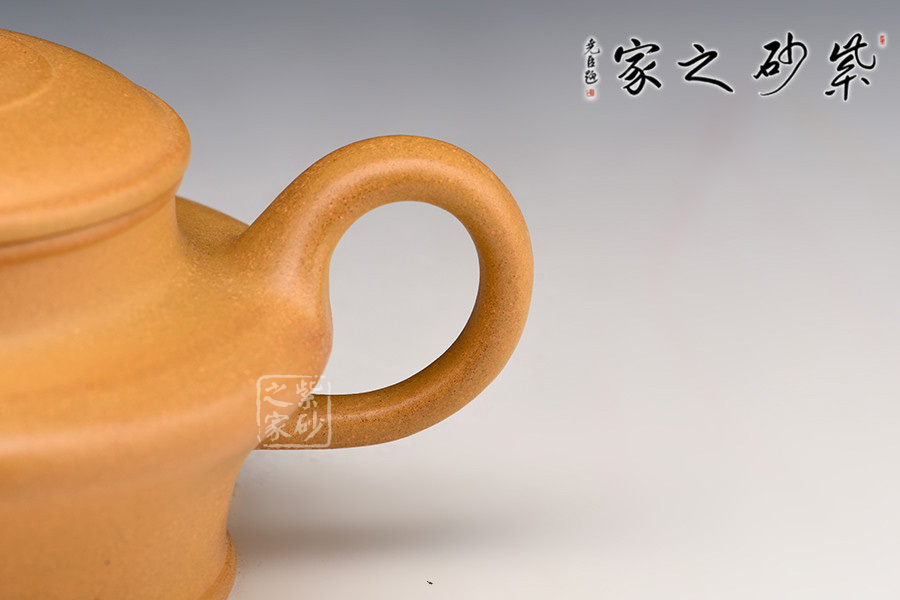 此壺為紫砂器中傳統(tǒng)的極扁造型,形狀雖扁而氣度昂揚(yáng),粗獷中透著豪氣。小巧的壺嘴與小圓把,配上扁形壺體,意趣盎然。這樣質(zhì)樸、凝重的壺,每個(gè)細(xì)節(jié)都凸顯出作者的精湛技藝。