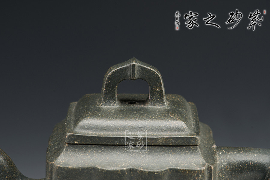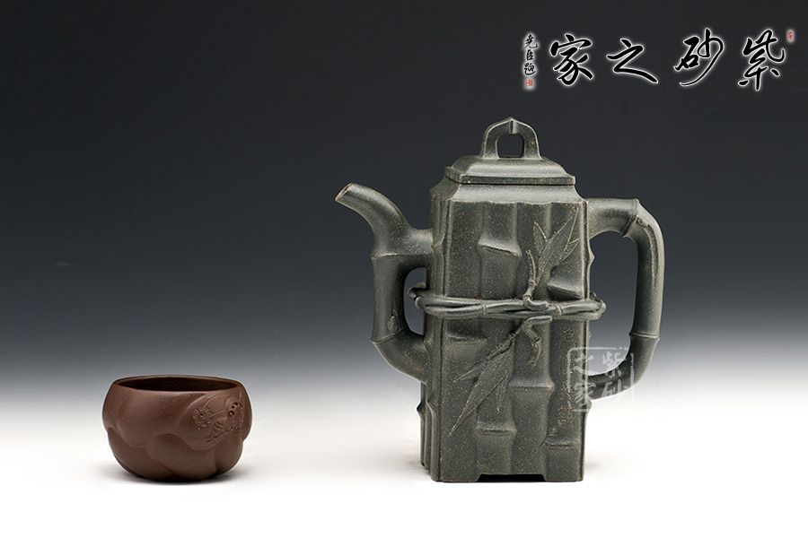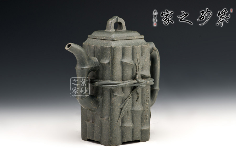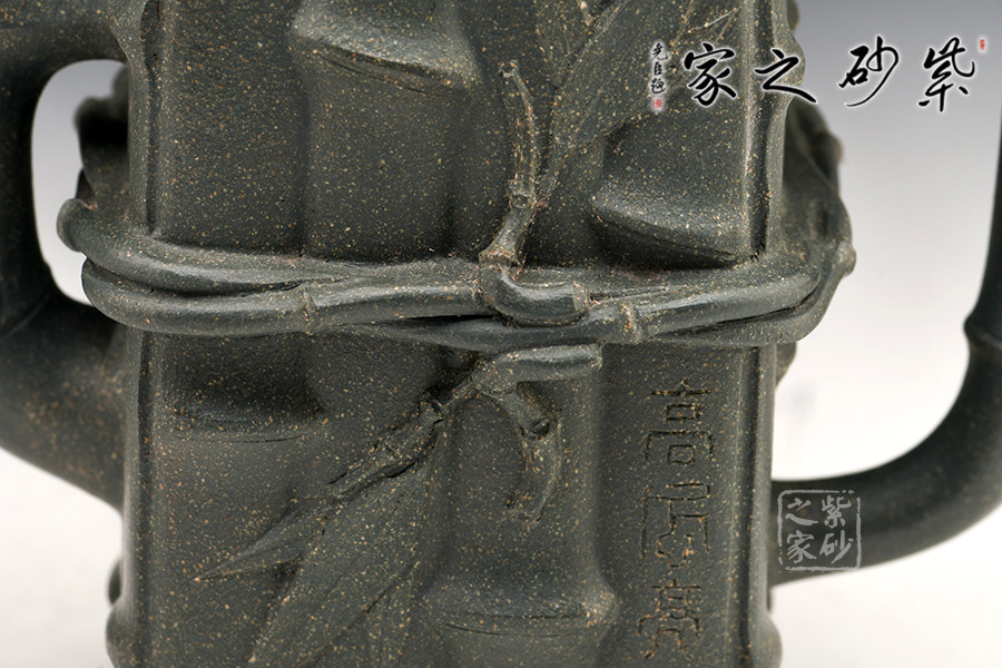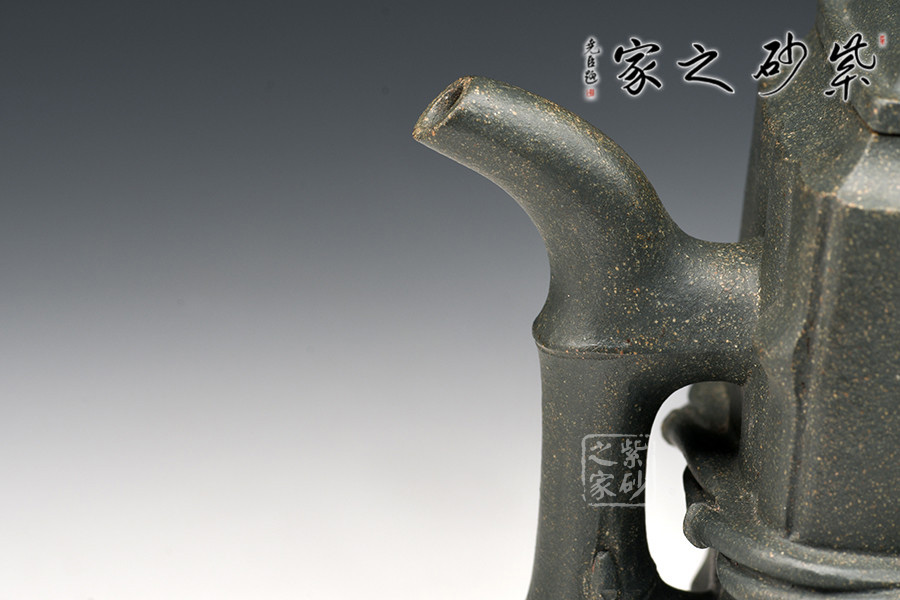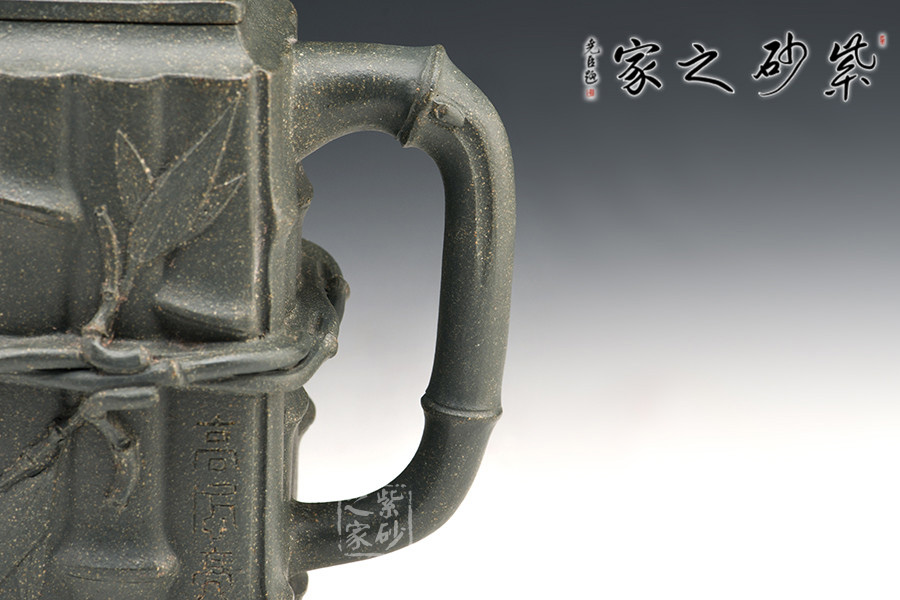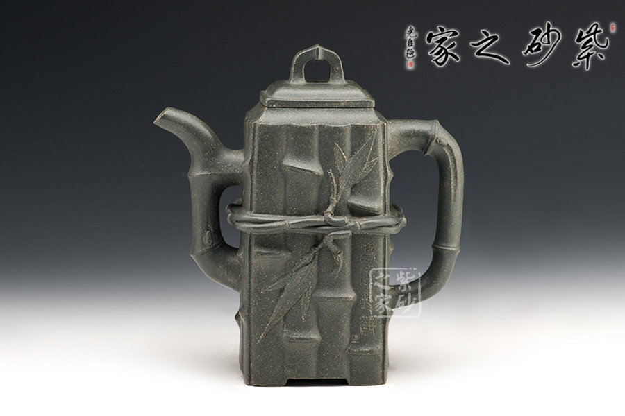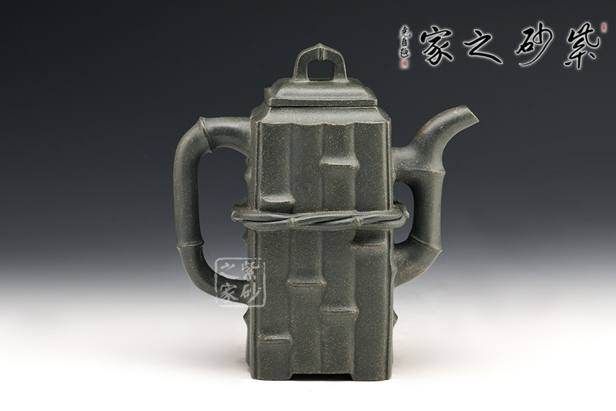 壺呈高四方形,豆青泥細(xì)密而堅(jiān)致,以多根竹竿并攏為壺身,竹節(jié)作繩扎帶。竹形三彎流上翹,竹節(jié)相繞做柄,嵌蓋上一曲竹枝鈕,制作看似隨意而法度嚴(yán)謹(jǐn),技藝高超。