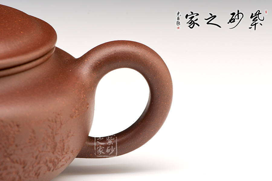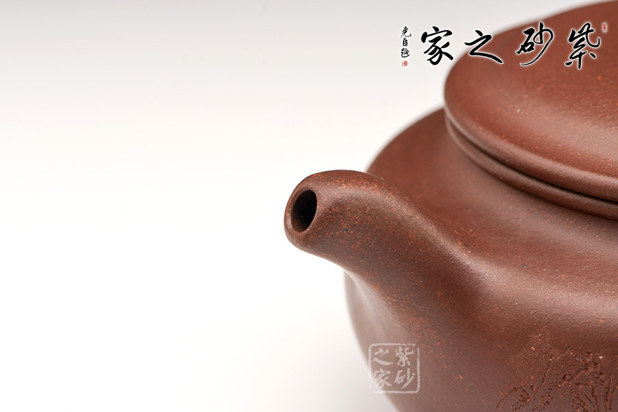 壺身與流、柄、蓋線條結(jié)合柔美,壺口與蓋口為兩條唇線組成,上下均等、比例適度,為此壺唯一兩條相合圓線,為此件作品的穩(wěn)重、協(xié)調(diào)起了重要作用。