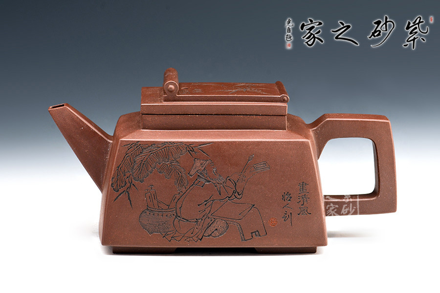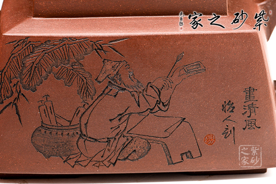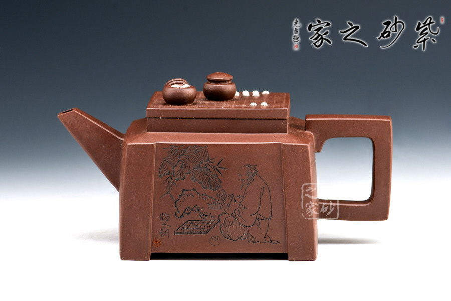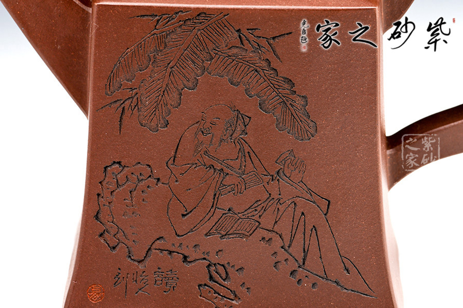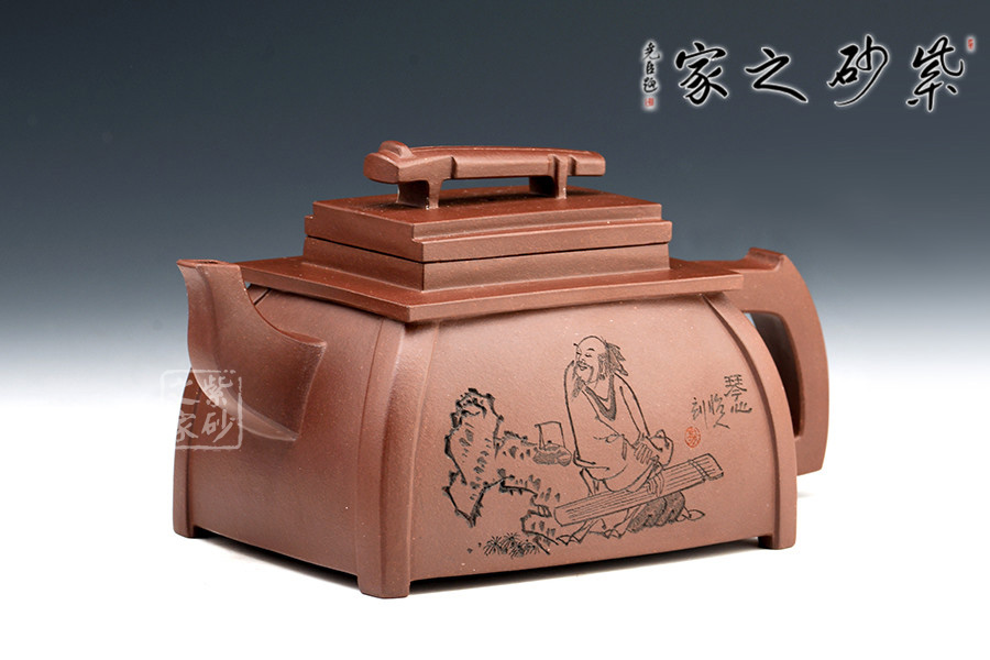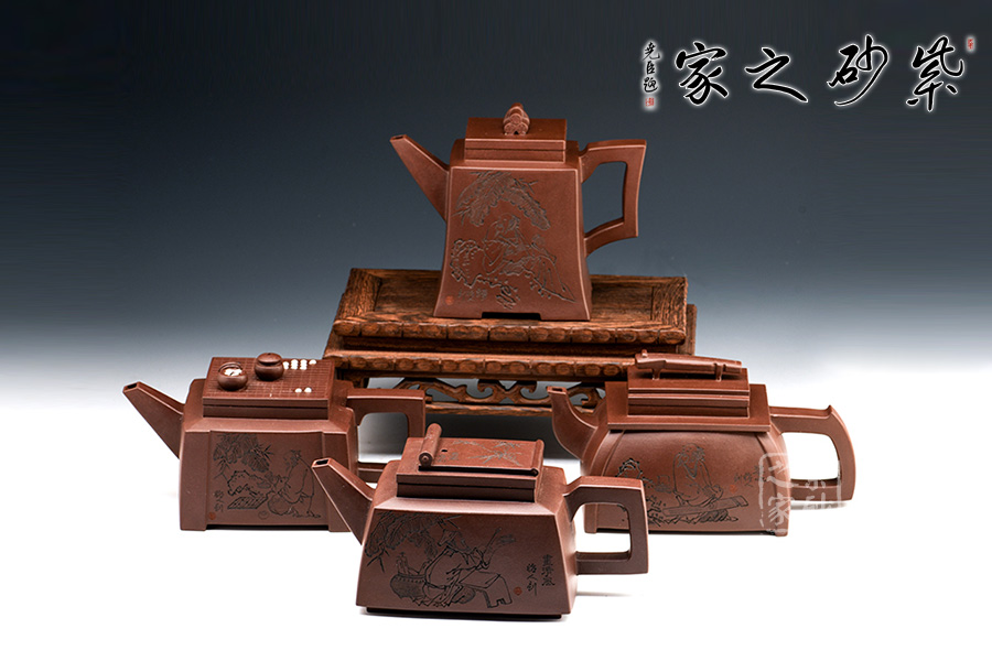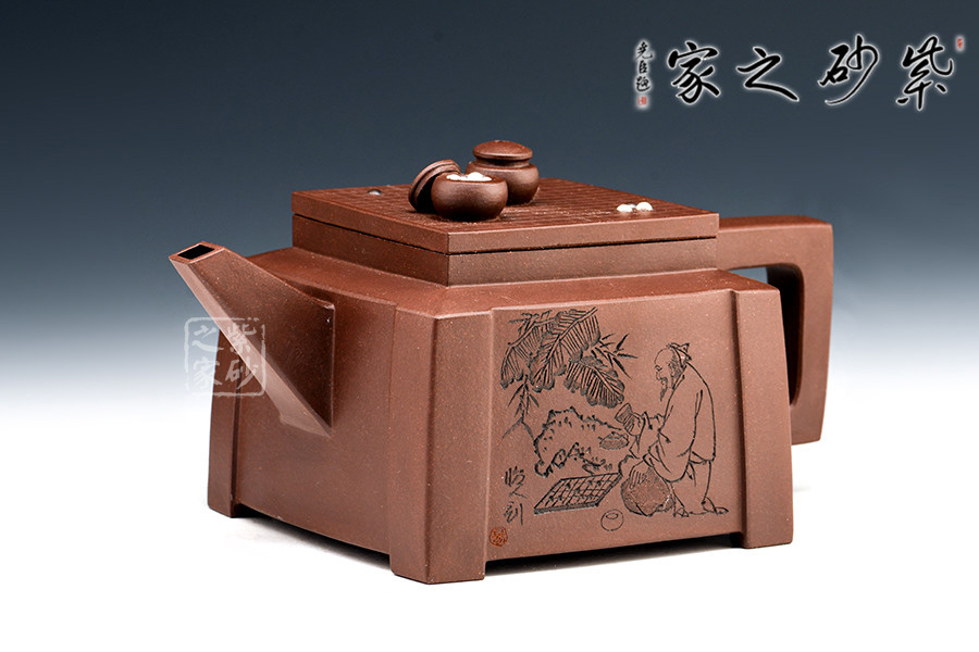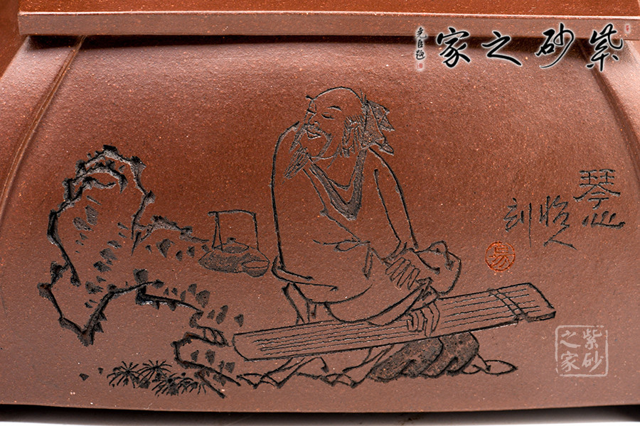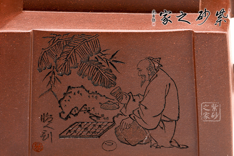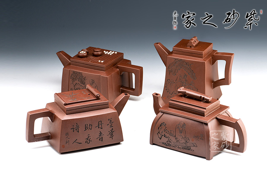 此套壺共四把,均為四方器型,上窄下闊,底部留有四足,穩(wěn)重大方。構(gòu)思巧妙也各有特色,方正中帶著君子的風(fēng)雅。壺蓋平,壺鈕分別為琴、棋、書、畫四種設(shè)計(jì),壺身也分別對(duì)應(yīng)著刻繪古人石邊撫琴、樹(shù)下潑墨、林中獨(dú)弈、臥石閱識(shí),將傳統(tǒng)文化與紫砂技藝結(jié)合,心思之巧妙可見(jiàn)一斑。無(wú)論是粗觀整壺還是細(xì)品其中韻味,壺中各處均透露著一個(gè)雅字。