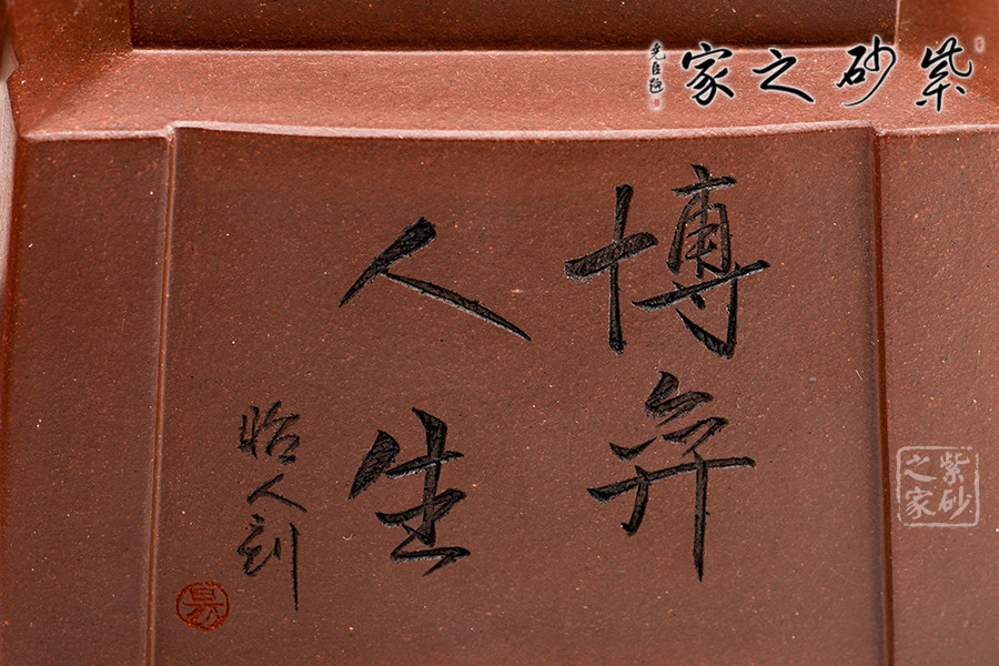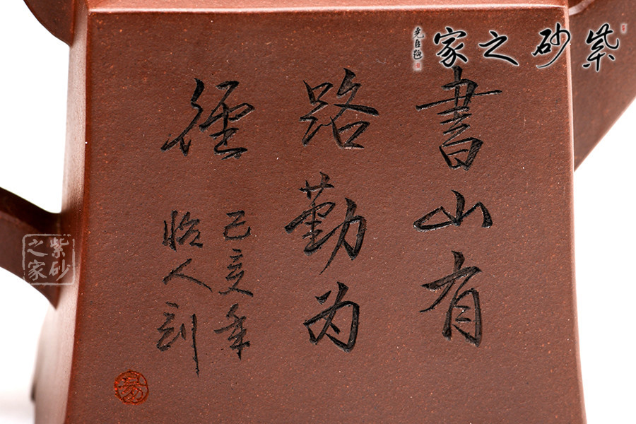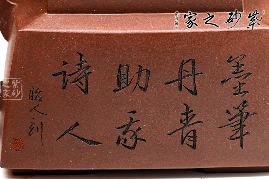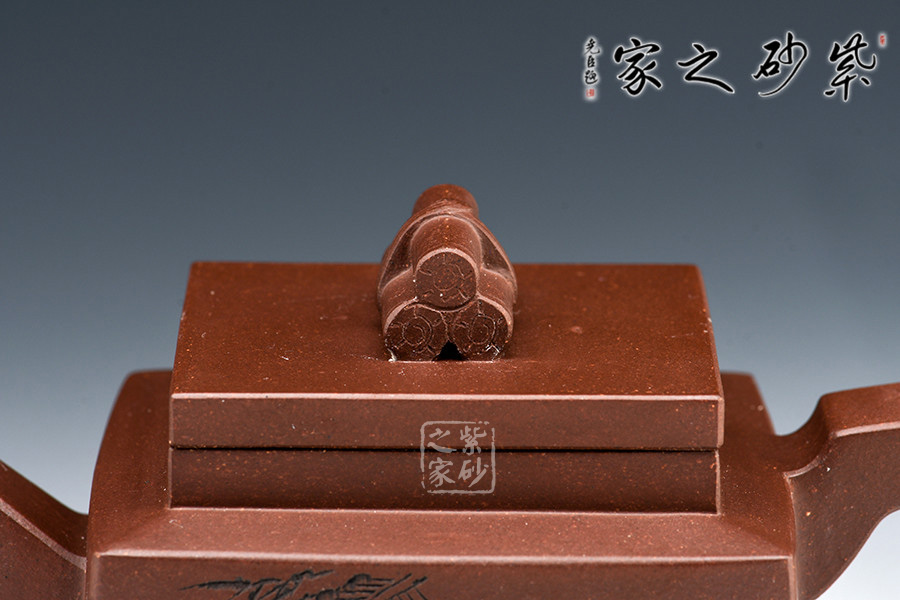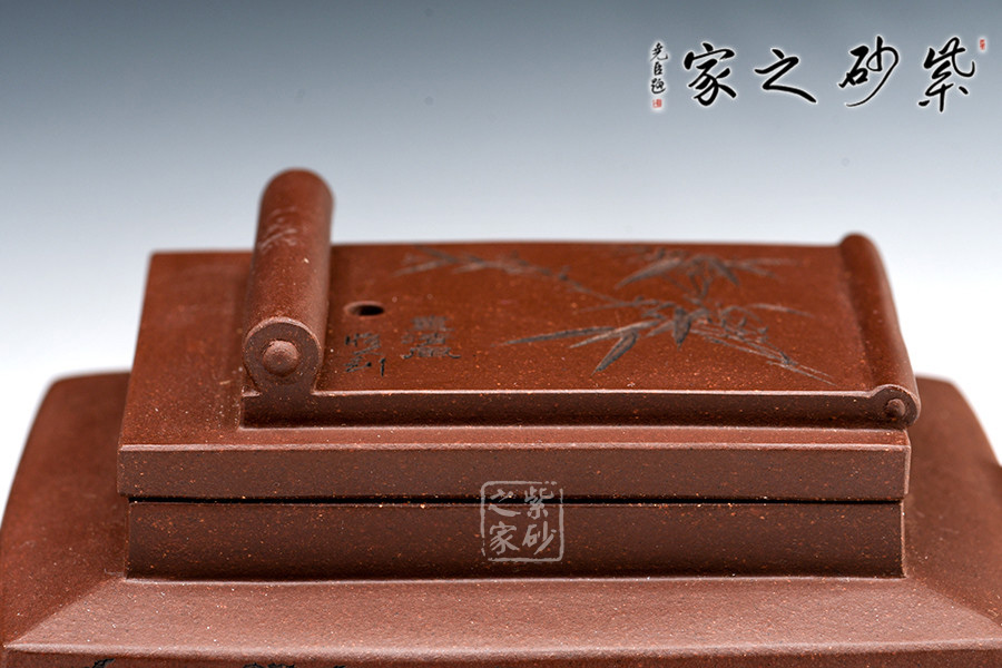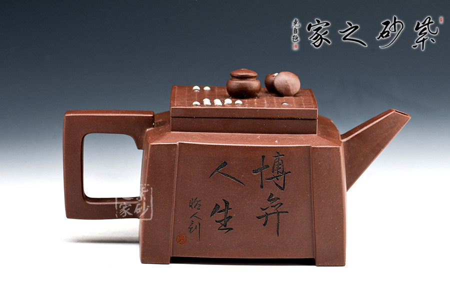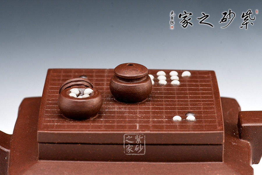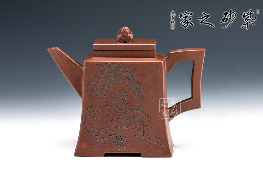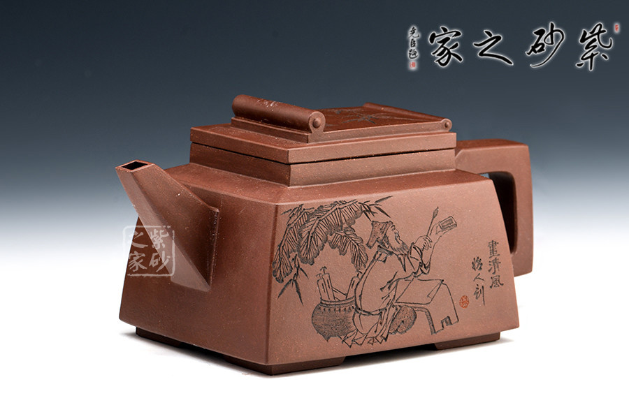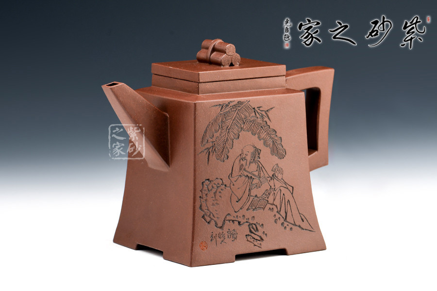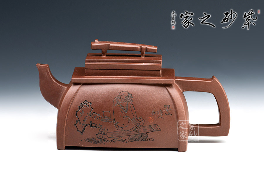 此套壺共四把,均為四方器型,上窄下闊,底部留有四足,穩(wěn)重大方。構(gòu)思巧妙也各有特色,方正中帶著君子的風(fēng)雅。壺蓋平,壺鈕分別為琴、棋、書、畫四種設(shè)計(jì),壺身也分別對(duì)應(yīng)著刻繪古人石邊撫琴、樹(shù)下潑墨、林中獨(dú)弈、臥石閱識(shí),將傳統(tǒng)文化與紫砂技藝結(jié)合,心思之巧妙可見(jiàn)一斑。無(wú)論是粗觀整壺還是細(xì)品其中韻味,壺中各處均透露著一個(gè)雅字。