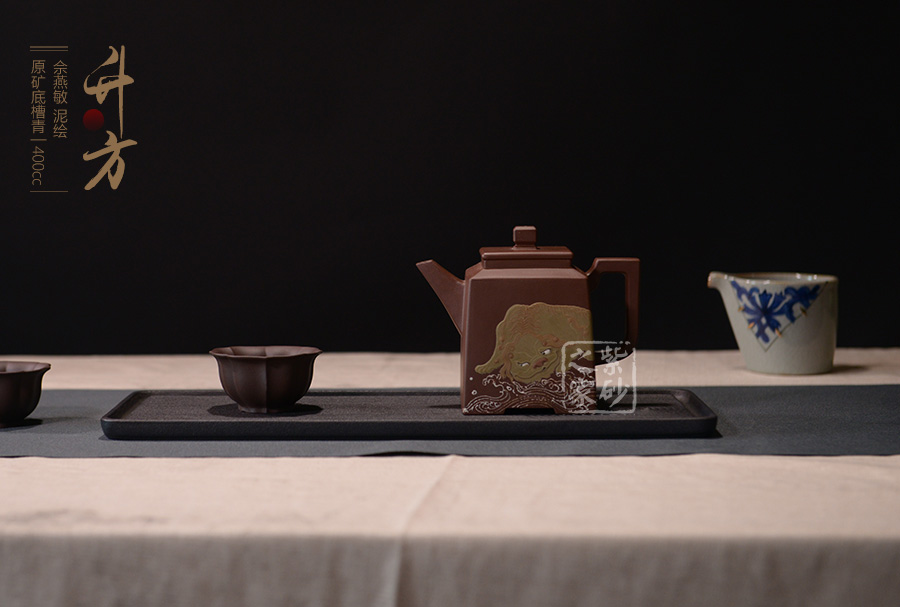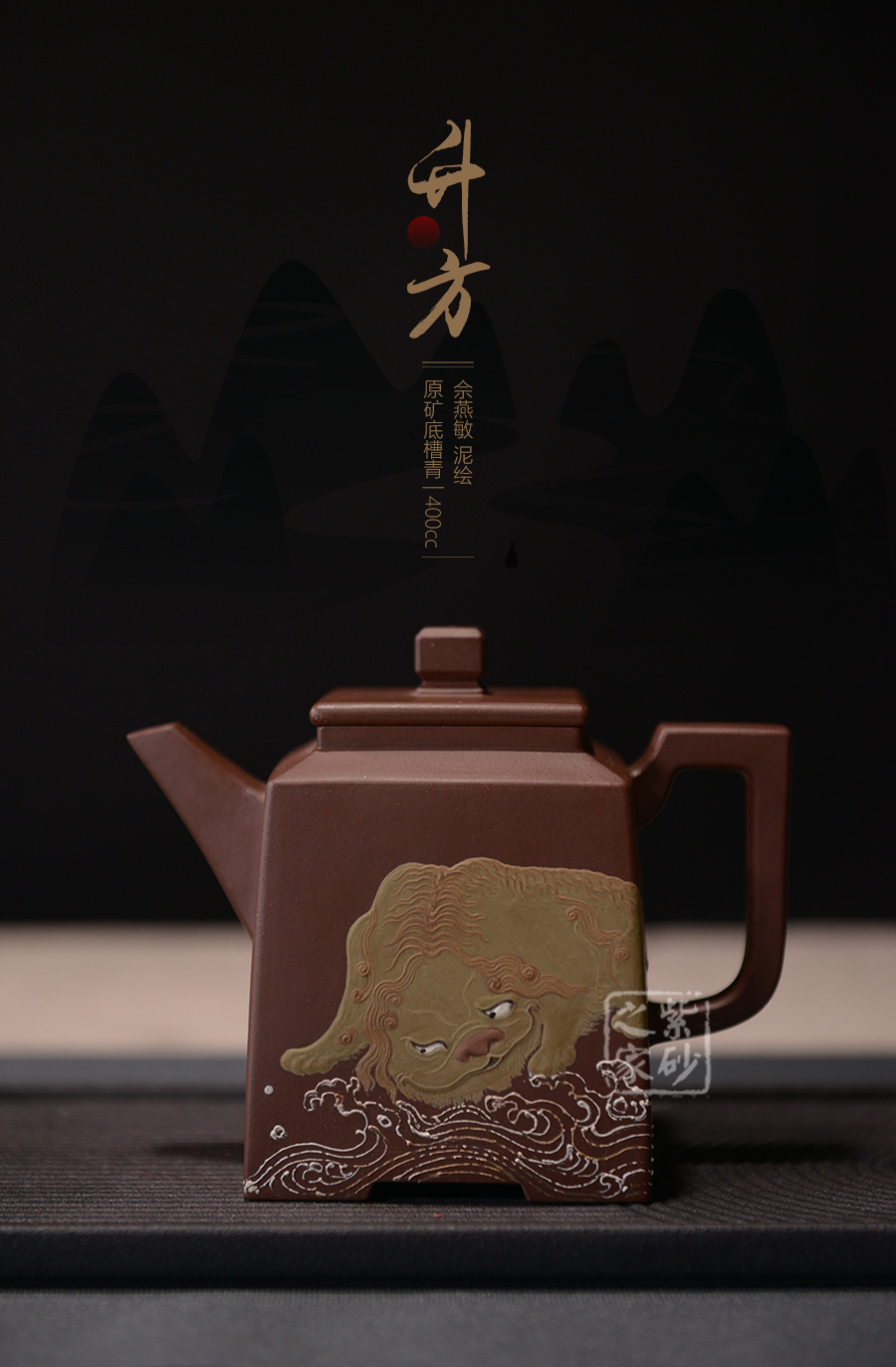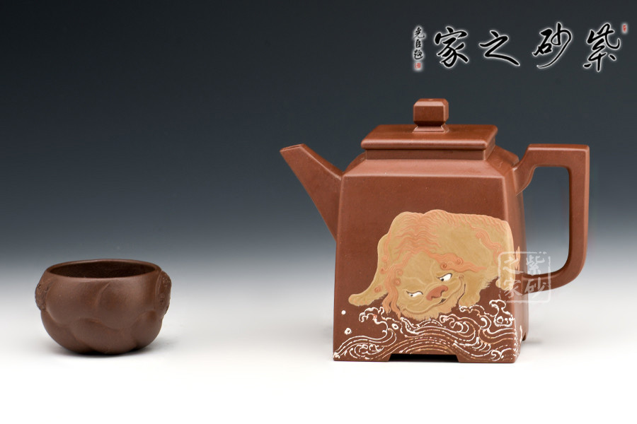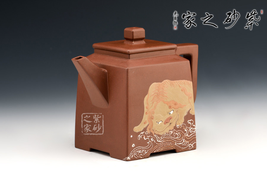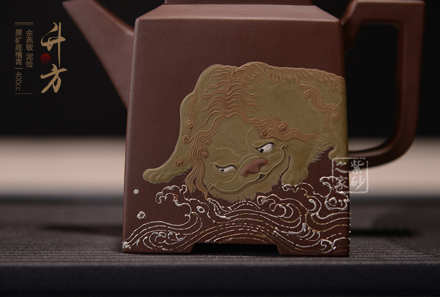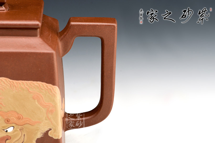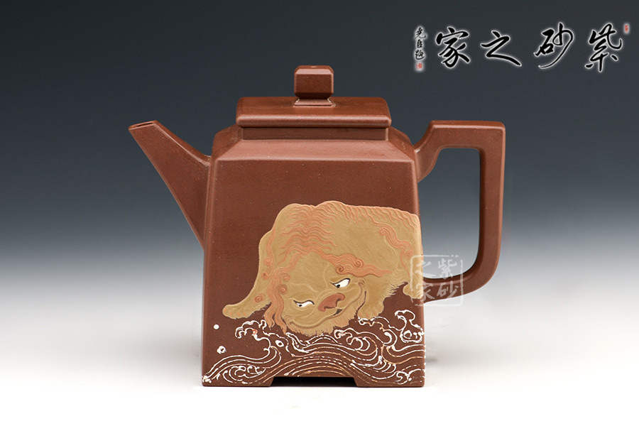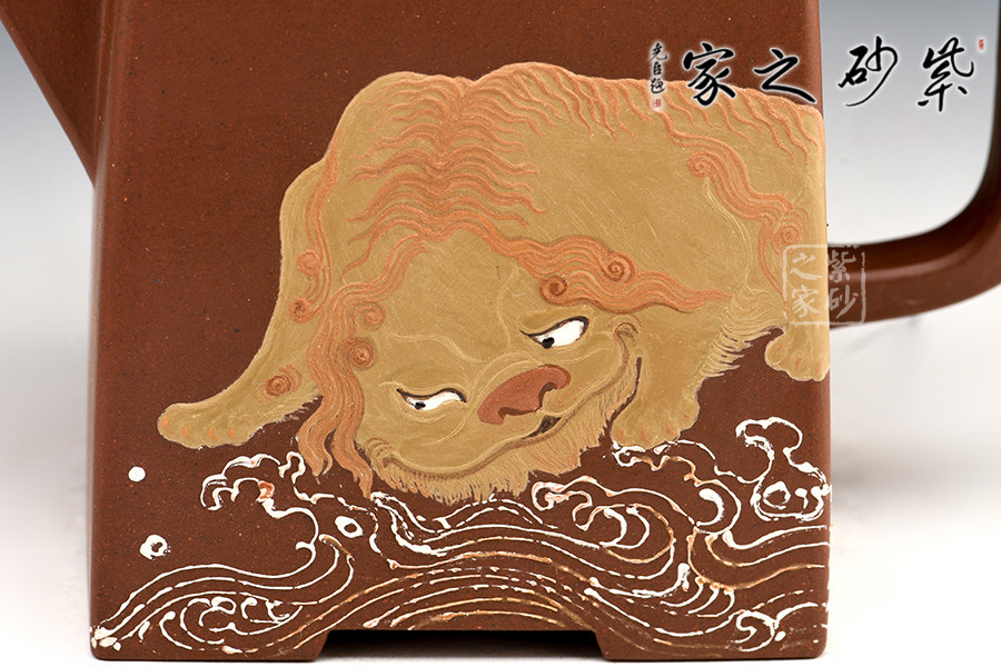 壺腹正面泥繪一只獅子慵懶得臥于海浪旁,反面泥繪:“無災(zāi)無難”,吉祥美好。整個器形威嚴(yán)周正,梭角分明,王者之氣盡顯砂壺上。