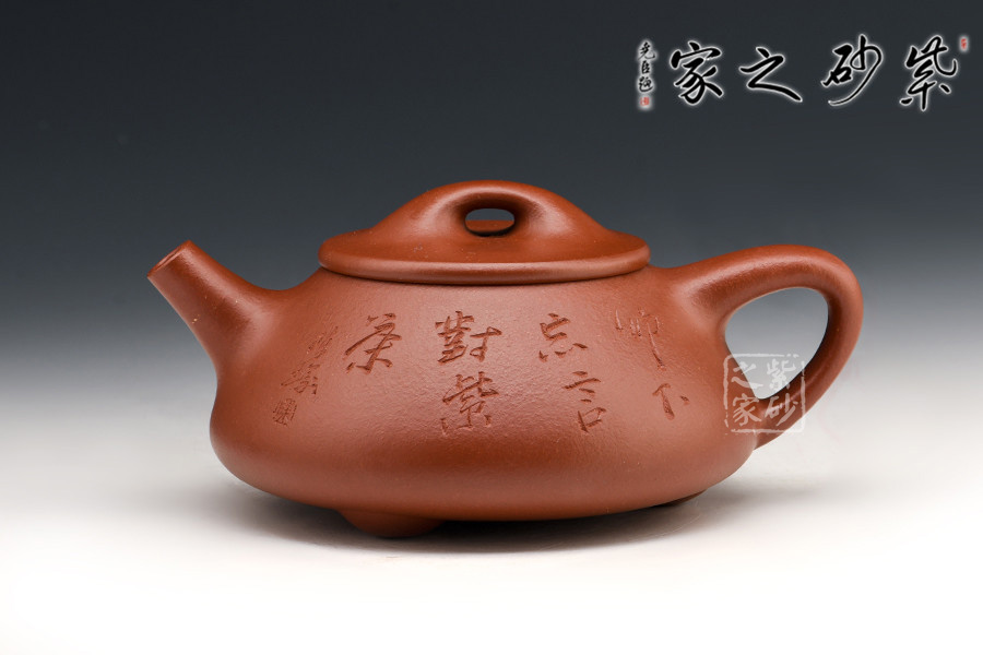 石瓢壺為光素器,制作難度大,全憑流、把、鈕及壺身的比例搭配來(lái)把握作品風(fēng)格。此壺造型挺拔,加之以上好朱砂泥制成,觀(guān)之光芒內(nèi)斂,韻味深沉。