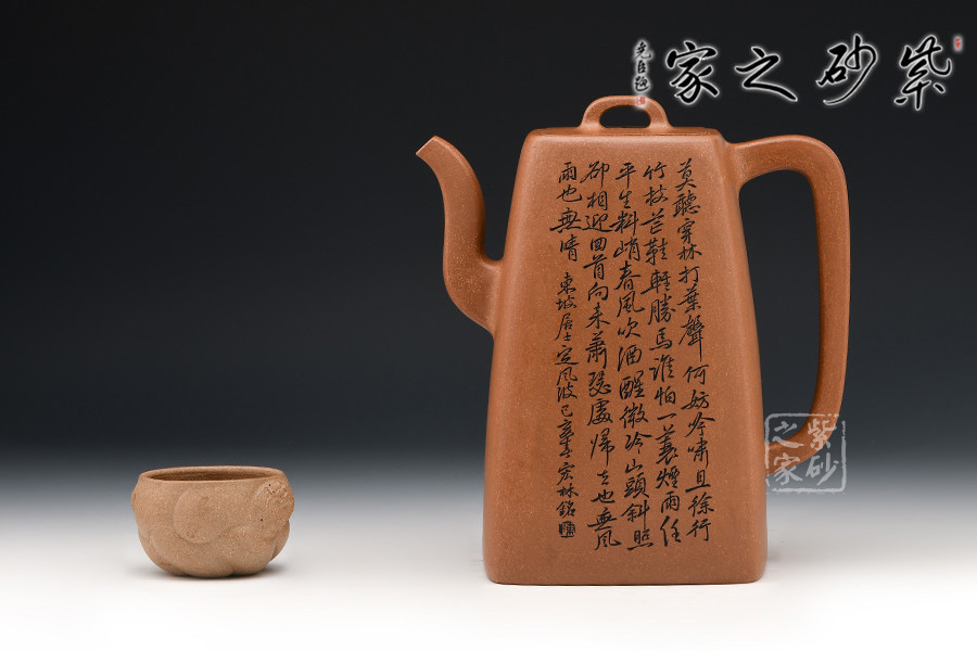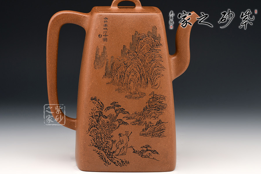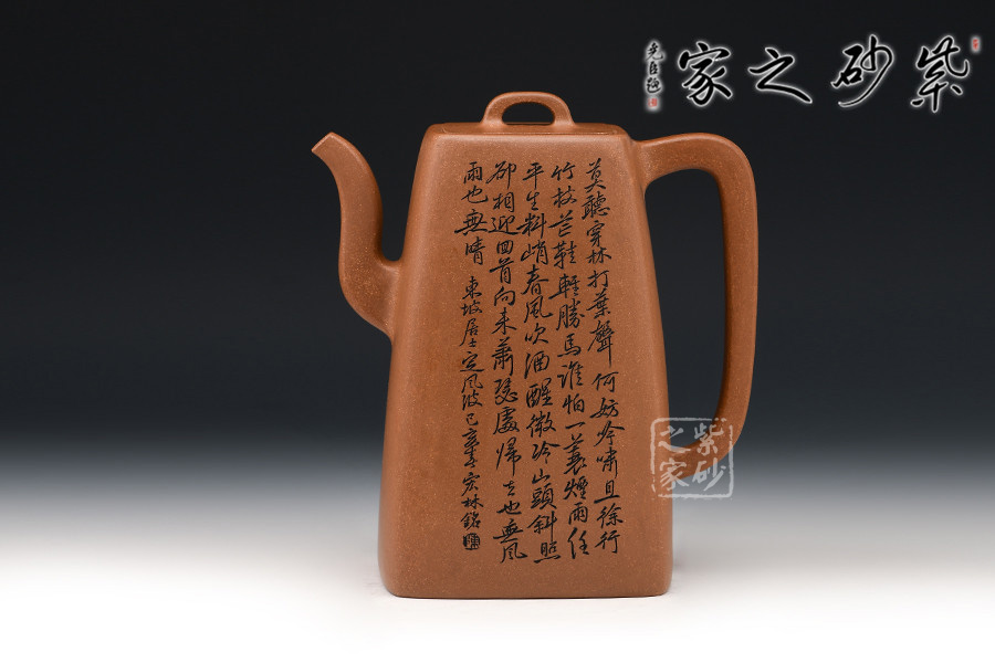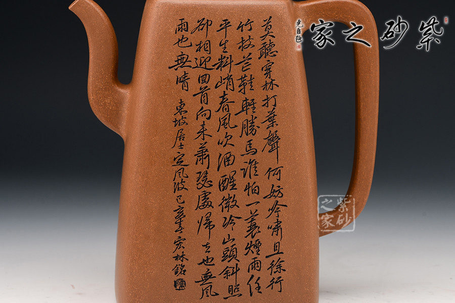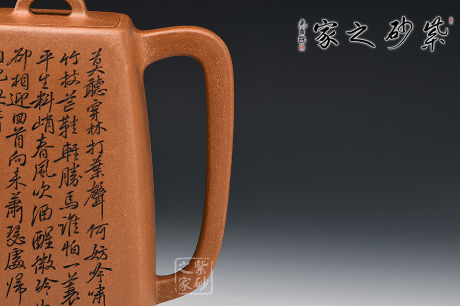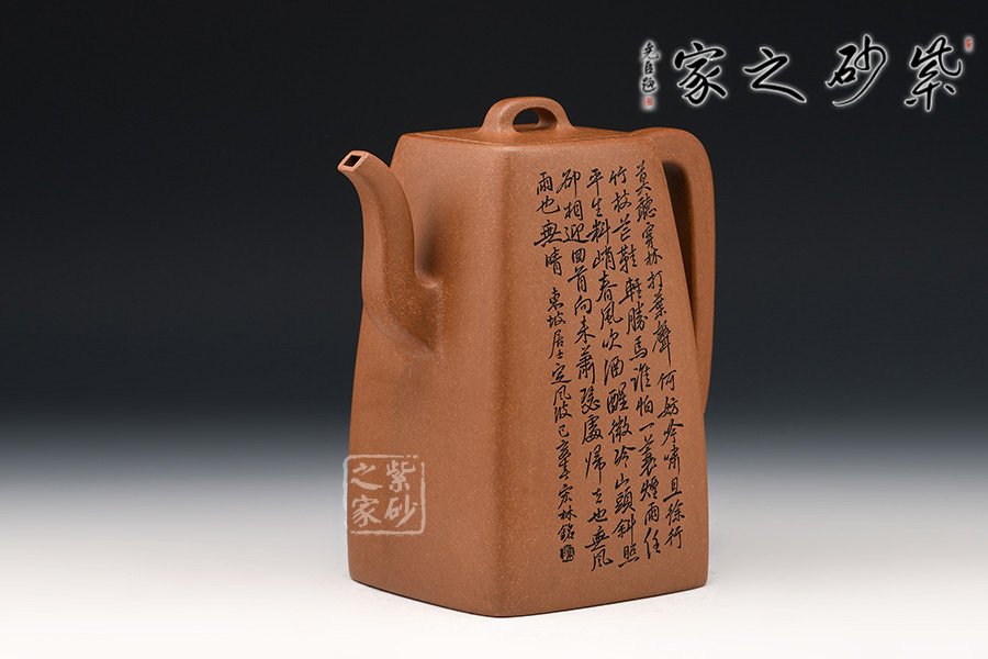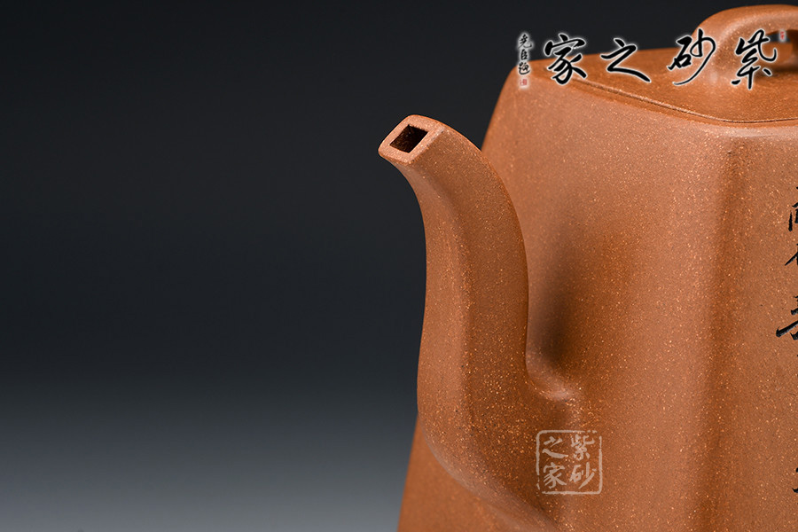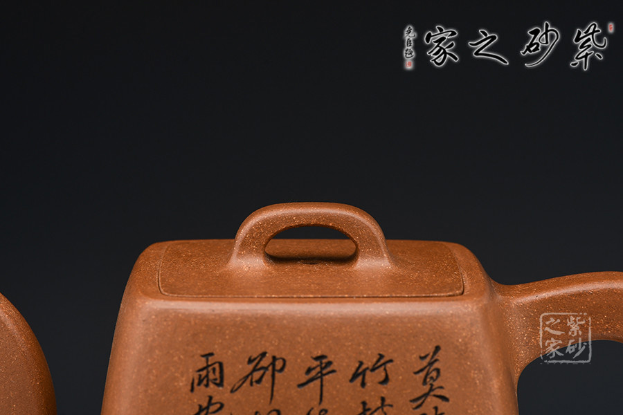 此壺造型端莊、大方,色澤溫和,功法嫻熟、老練。壺身呈上略寬、下略窄的四方狀。蓋面與壺上口沿以嵌蓋的形式連接,連接處周正而合縫,足以見陳老師制壺技藝之高超。一彎四方嘴、四方耳狀把,比例協(xié)調(diào)、搭配合理,并與壺身相呼應(yīng),大品的容量氣度,更突顯整器挺拔的氣質(zhì),收藏價值不凡。